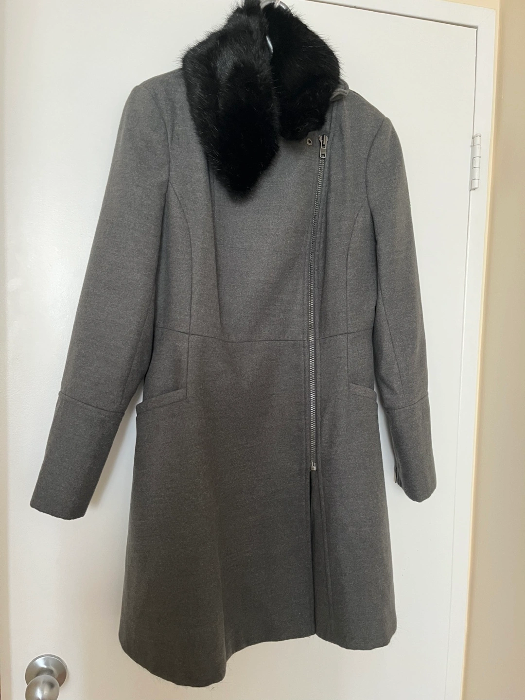 Stylish grey A-line coat. Features a detachable faux fur collar and zipper closure. Long sleeves with zippered cuffs. Flared silhouette. Great for colder weather.