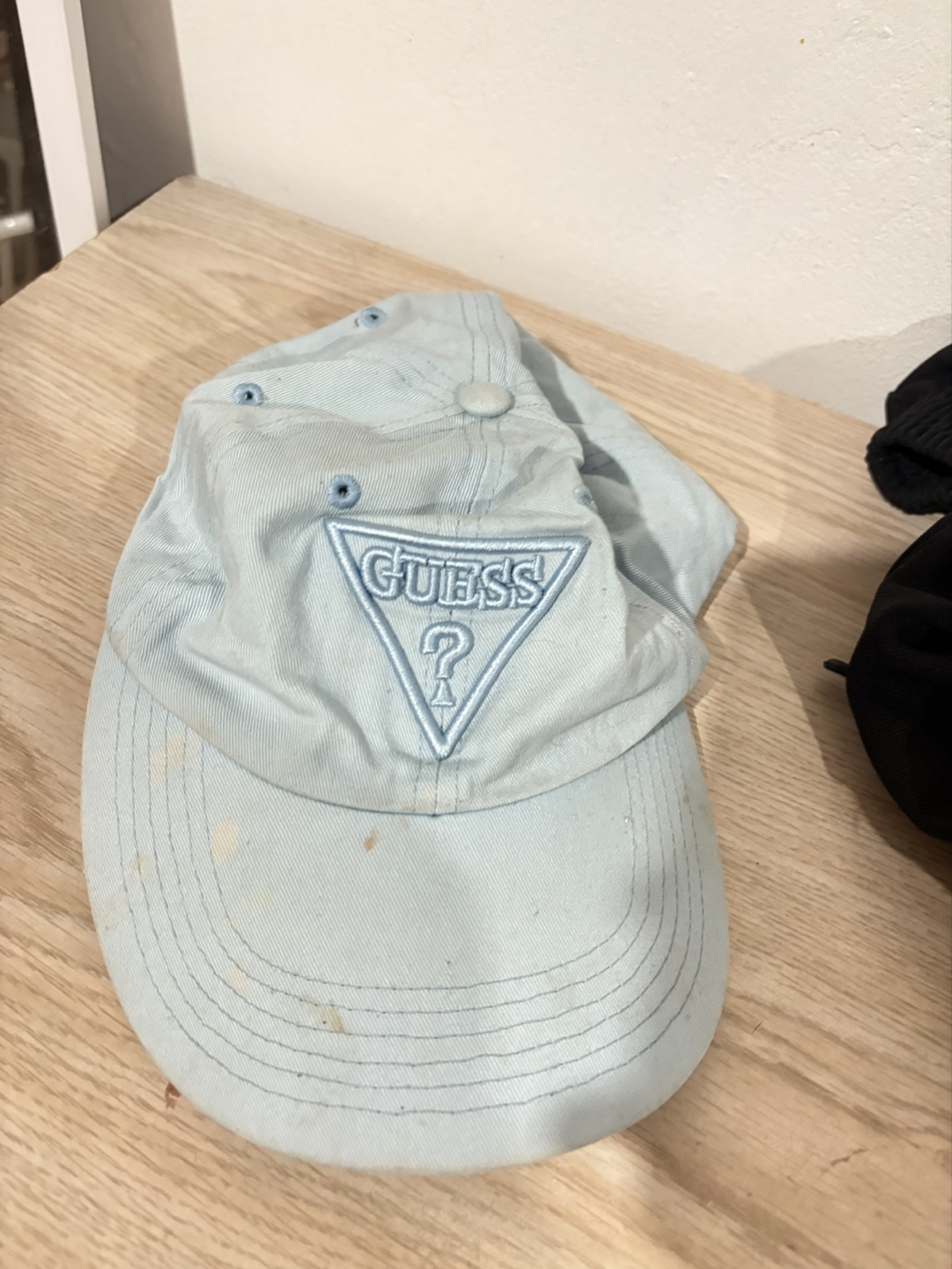 Lightly used Guess baseball cap. Features a light blue colour and the iconic Guess logo. Shows some minor wear.