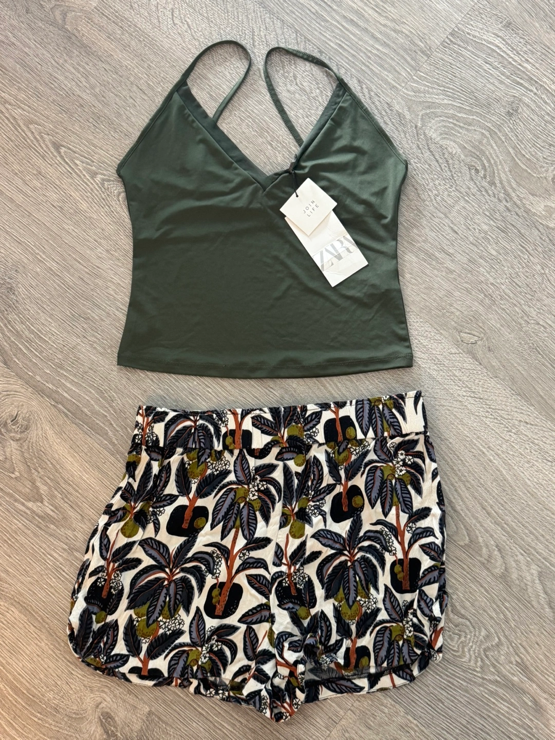 Zara Olive Green Tank Top and Floral Print Shorts Set