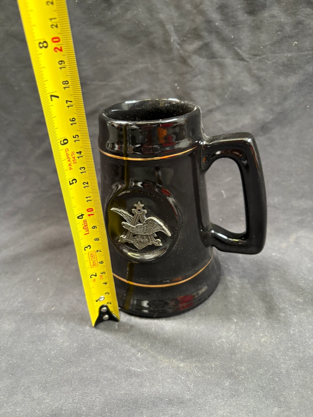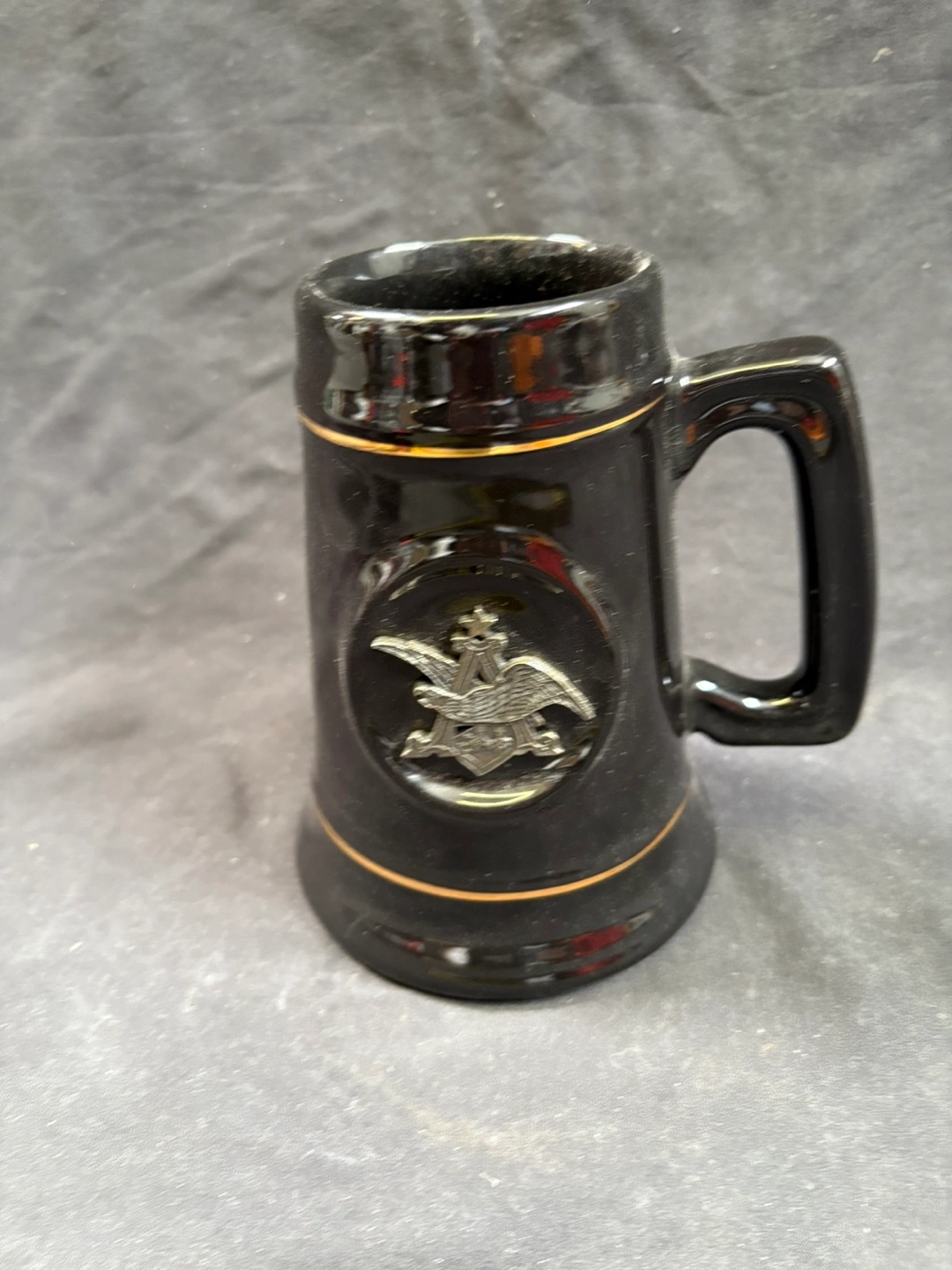 good condition Vintage Black Beer Stein Black ceramic beer stein. Features gold accents and an embossed logo. Approximately 4 inches tall. Collectible.