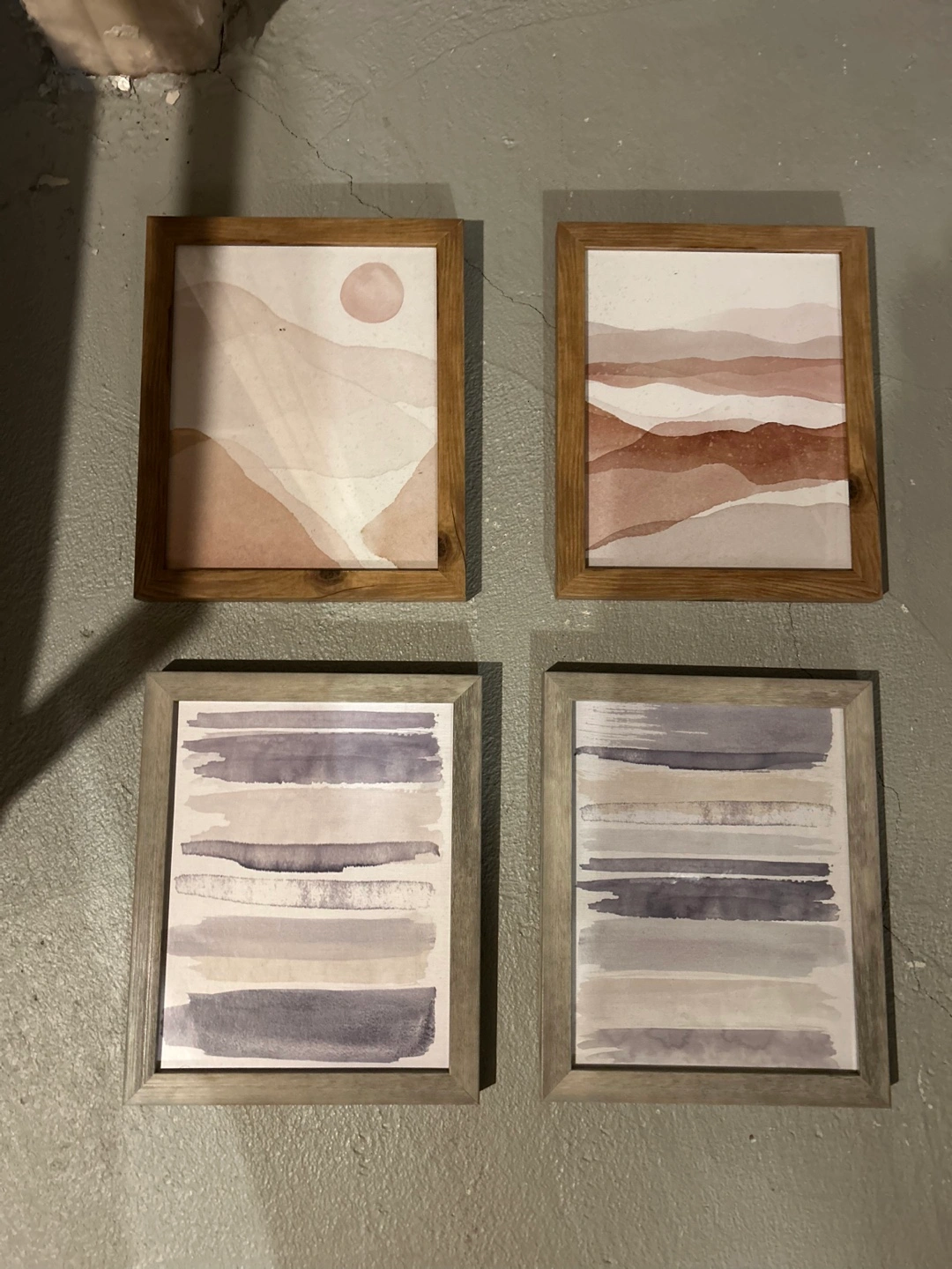 Four framed watercolor prints. Two feature abstract landscapes in shades of brown and pink. Two feature horizontal stripes in shades of grey and beige. Wooden frames. Perfect for adding a touch of modern art to your space.