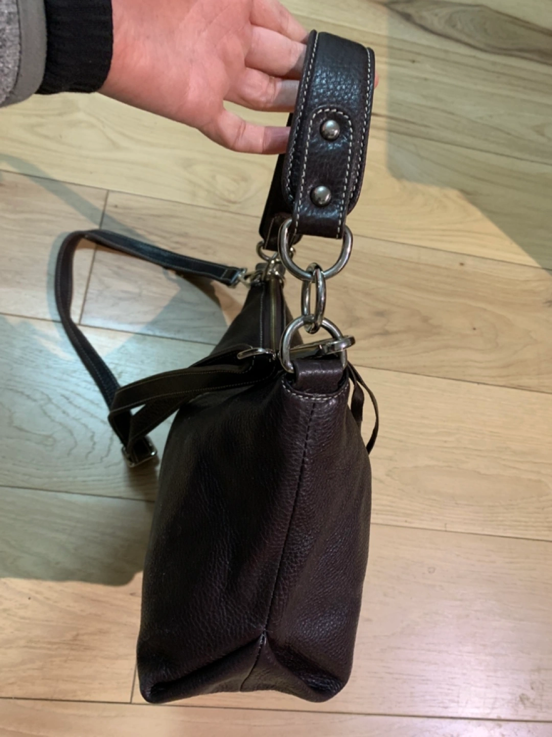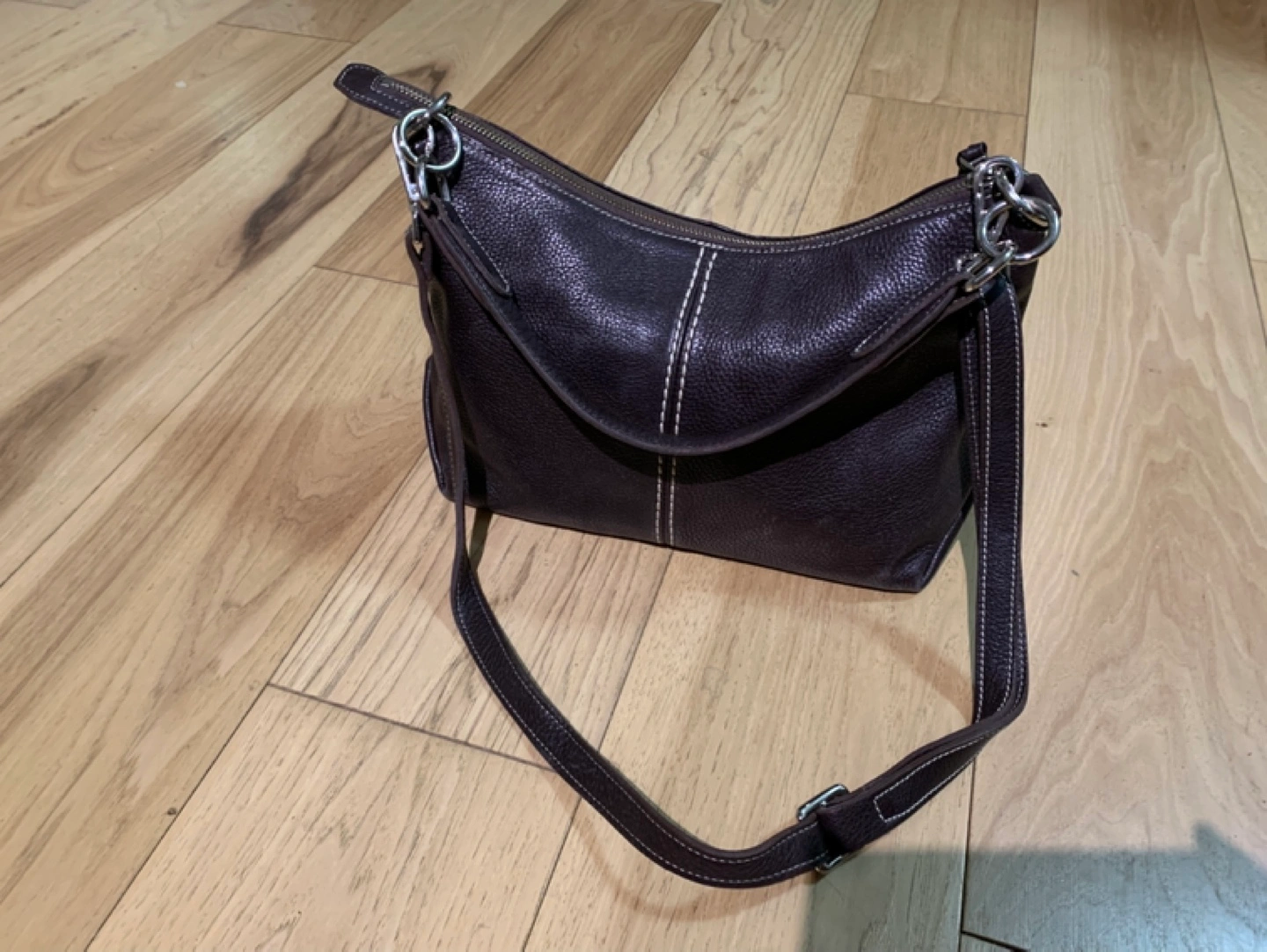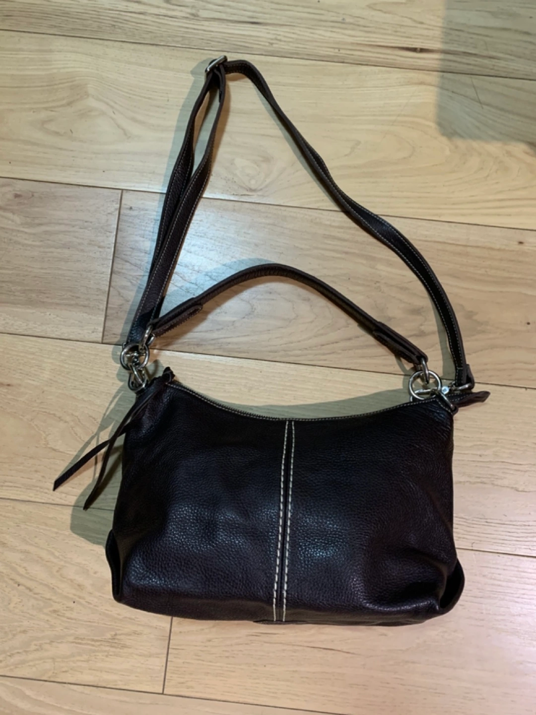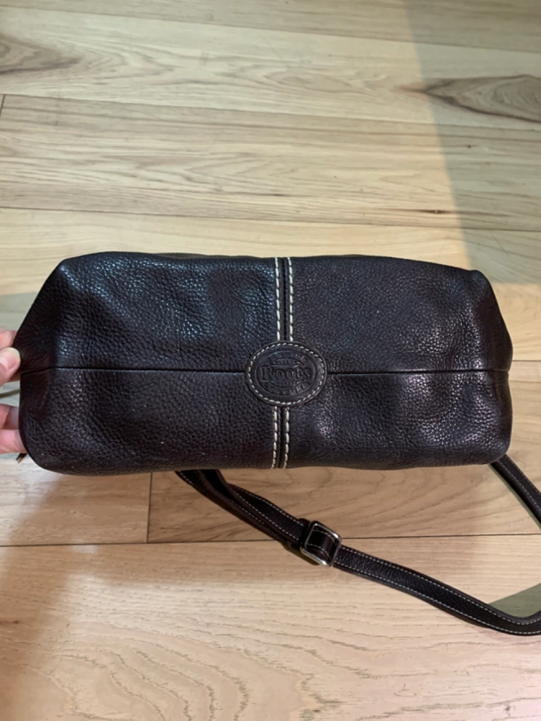 Brand new never used. Roots Dark brown leather shoulder bag. Adjustable strap. Zip closure. Interior pocket.