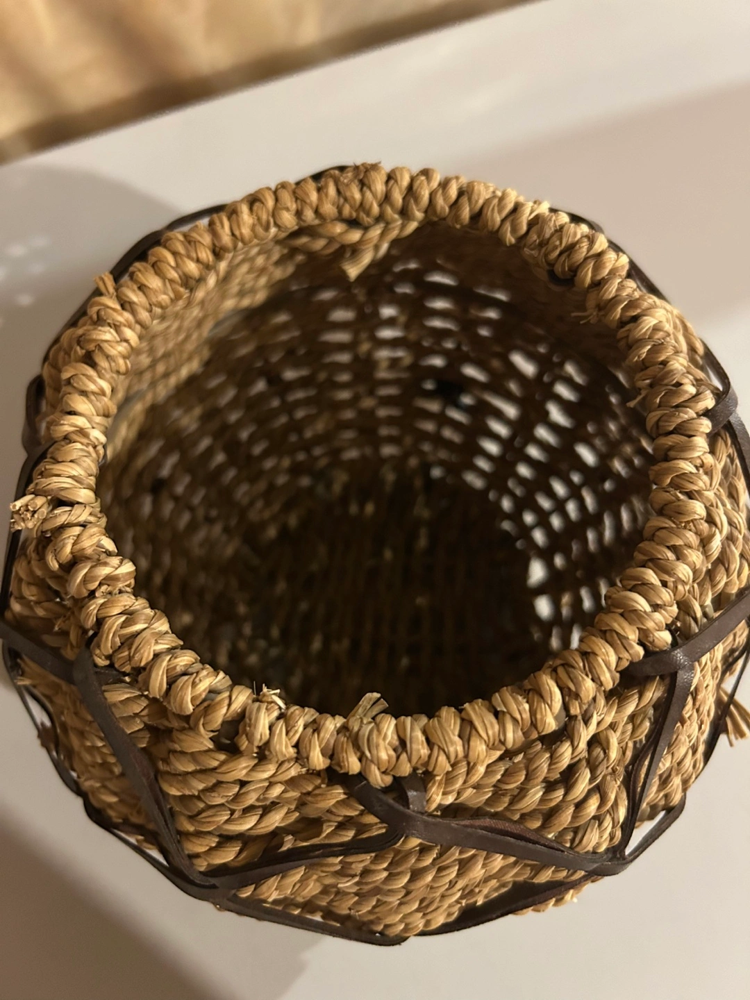 Small decorative basket. Woven seagrass construction. Features dark brown leather accents. Perfect for small plants, trinkets, or home decor.