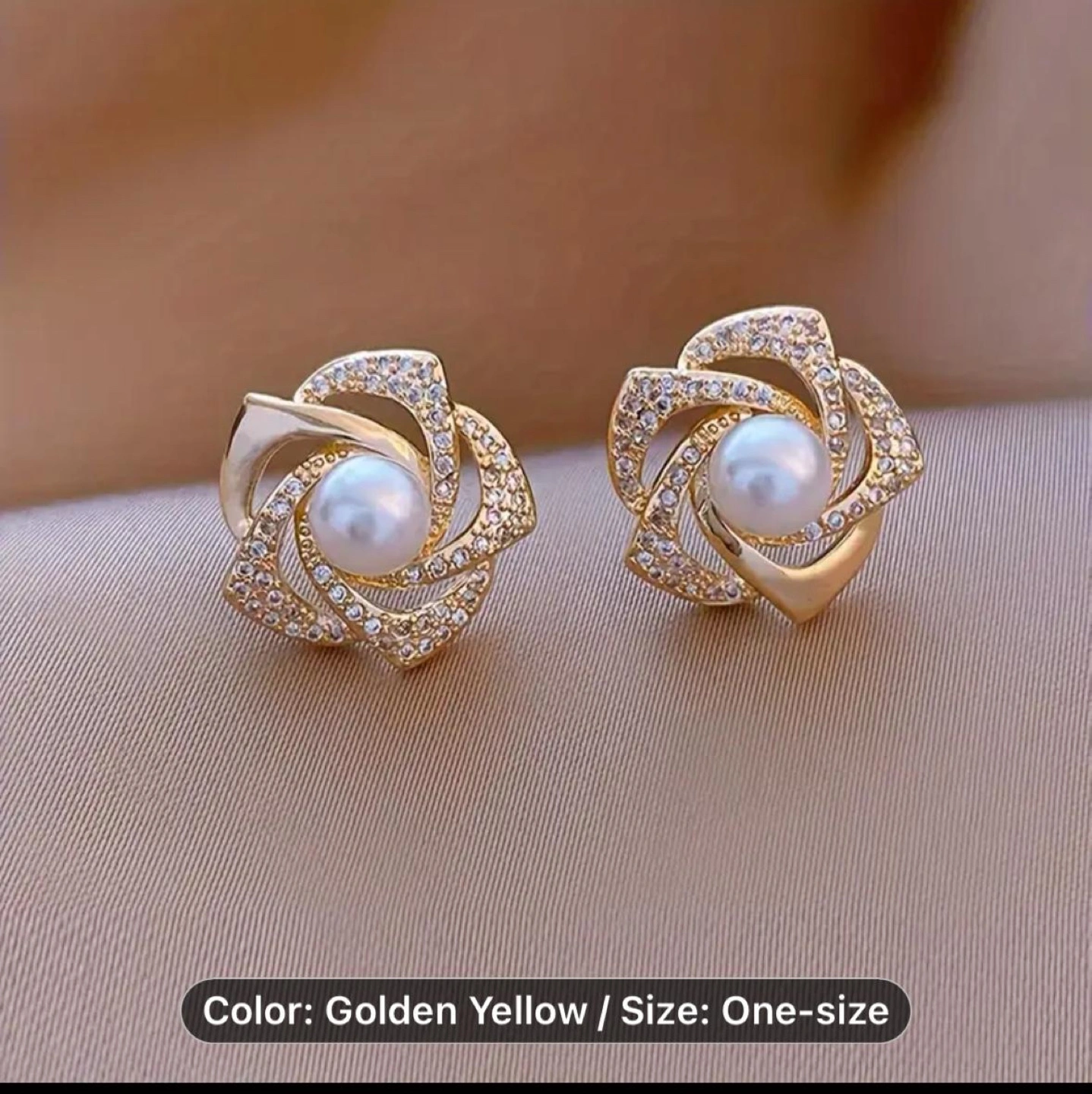 Gold-tone stud earrings. Features a pearl centrepiece surrounded by clear cubic zirconia stones. Flower design. One size.