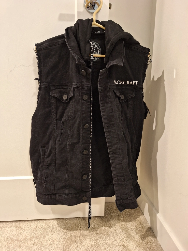 Black denim vest. Sleeveless. Features attached hoodie. Distressed denim. Blackcraft Cult branding throughout.