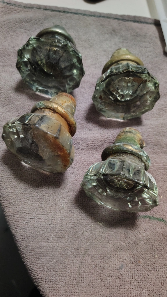Set of four antique glass door knobs. Faceted glass design. Metal bases show age and wear. Great for restoration projects or vintage decor.