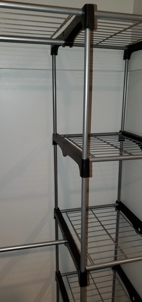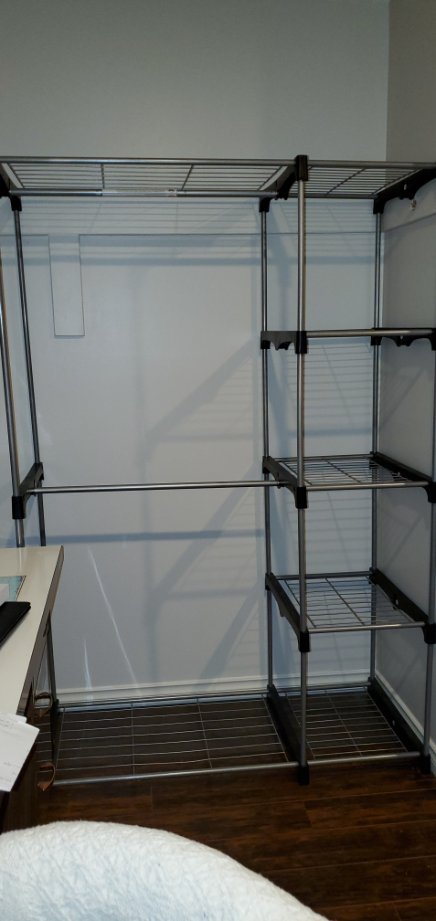 Silver metal frame. Multiple shelves and a hanging rod. Easy assembly.