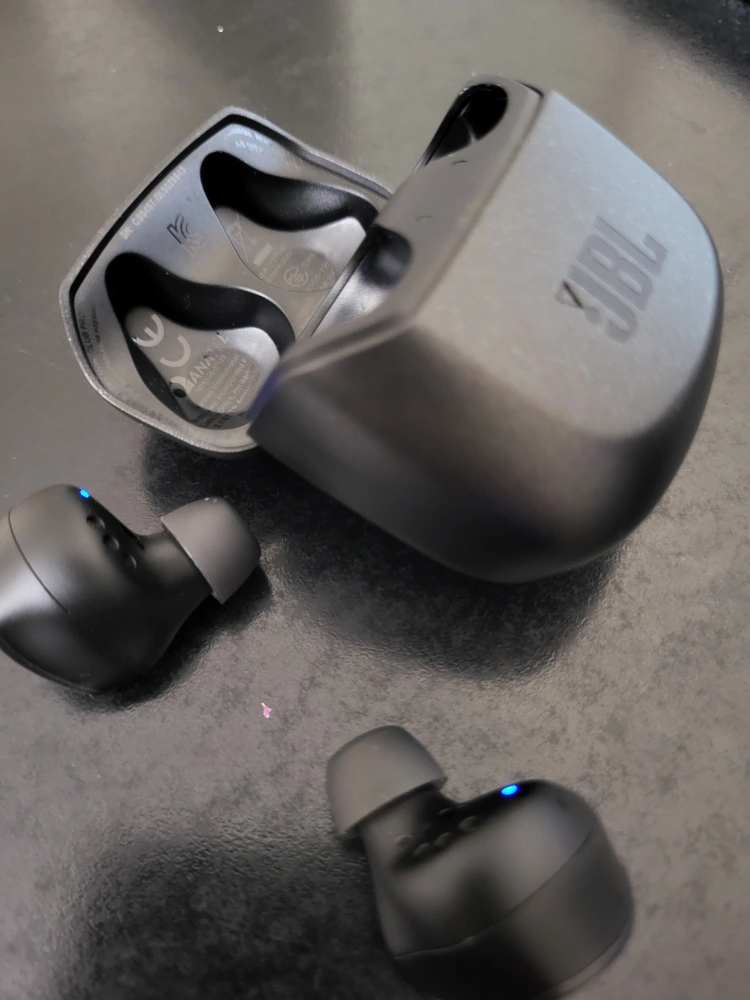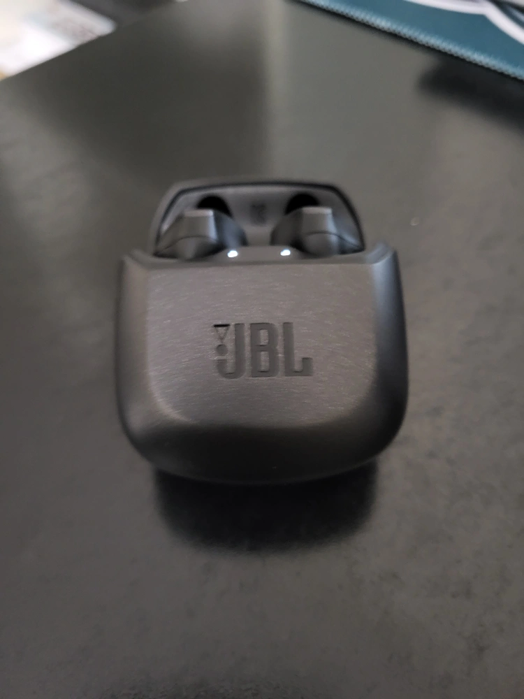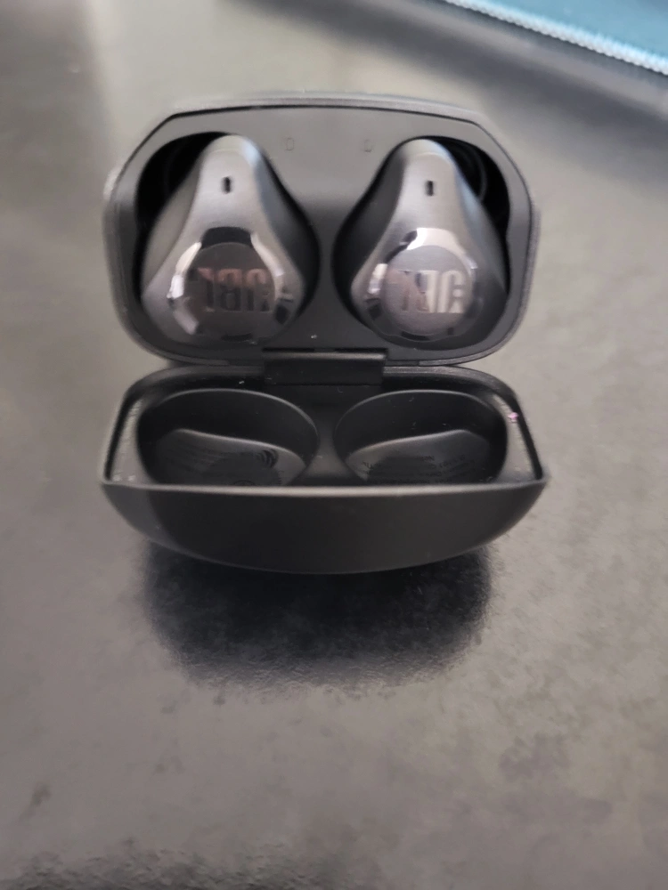 Black JBL wireless earbuds. Charging case included. Excellent sound quality. Portable and convenient. Perfect for workouts and everyday use.