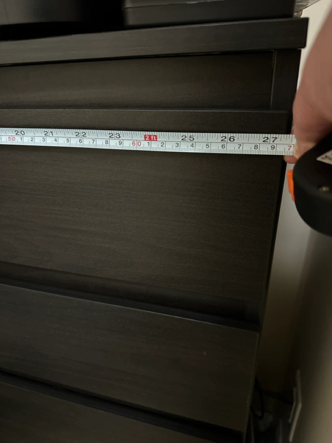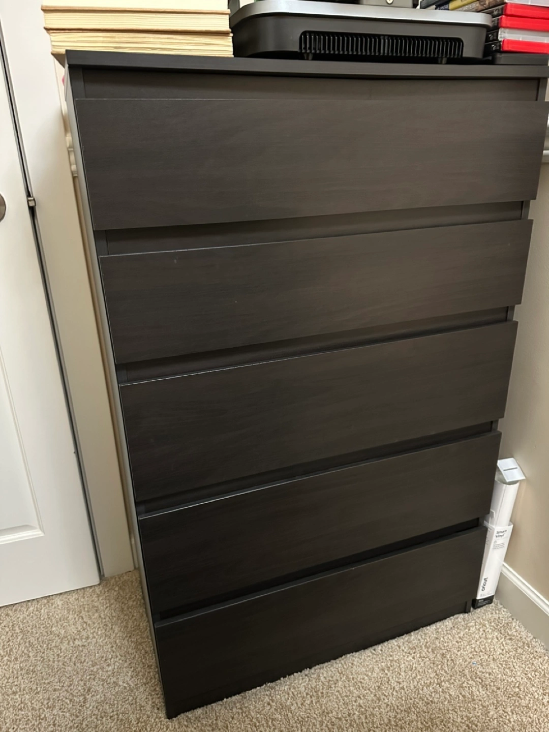 Five-drawer dresser. Dark brown. Excellent condition. Measures approximately 27 inches wide.