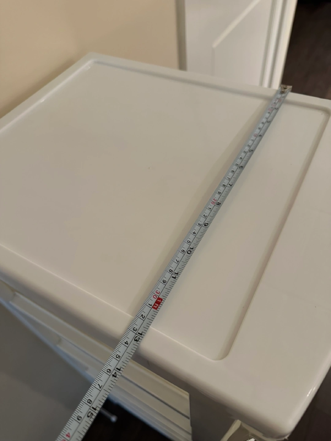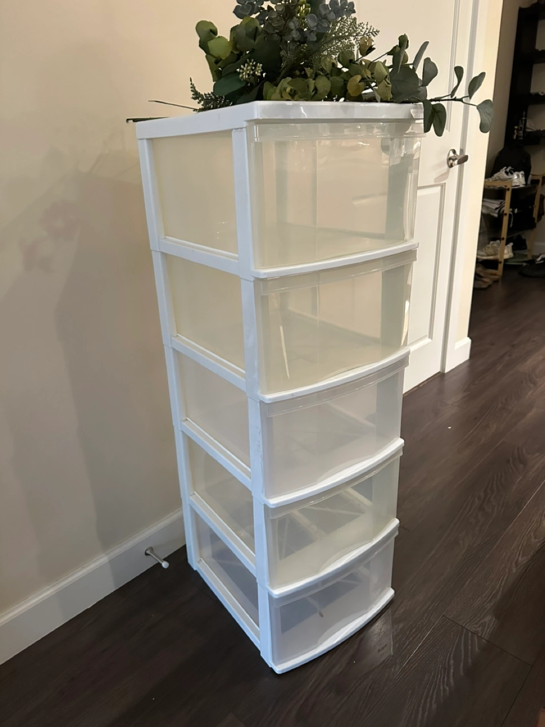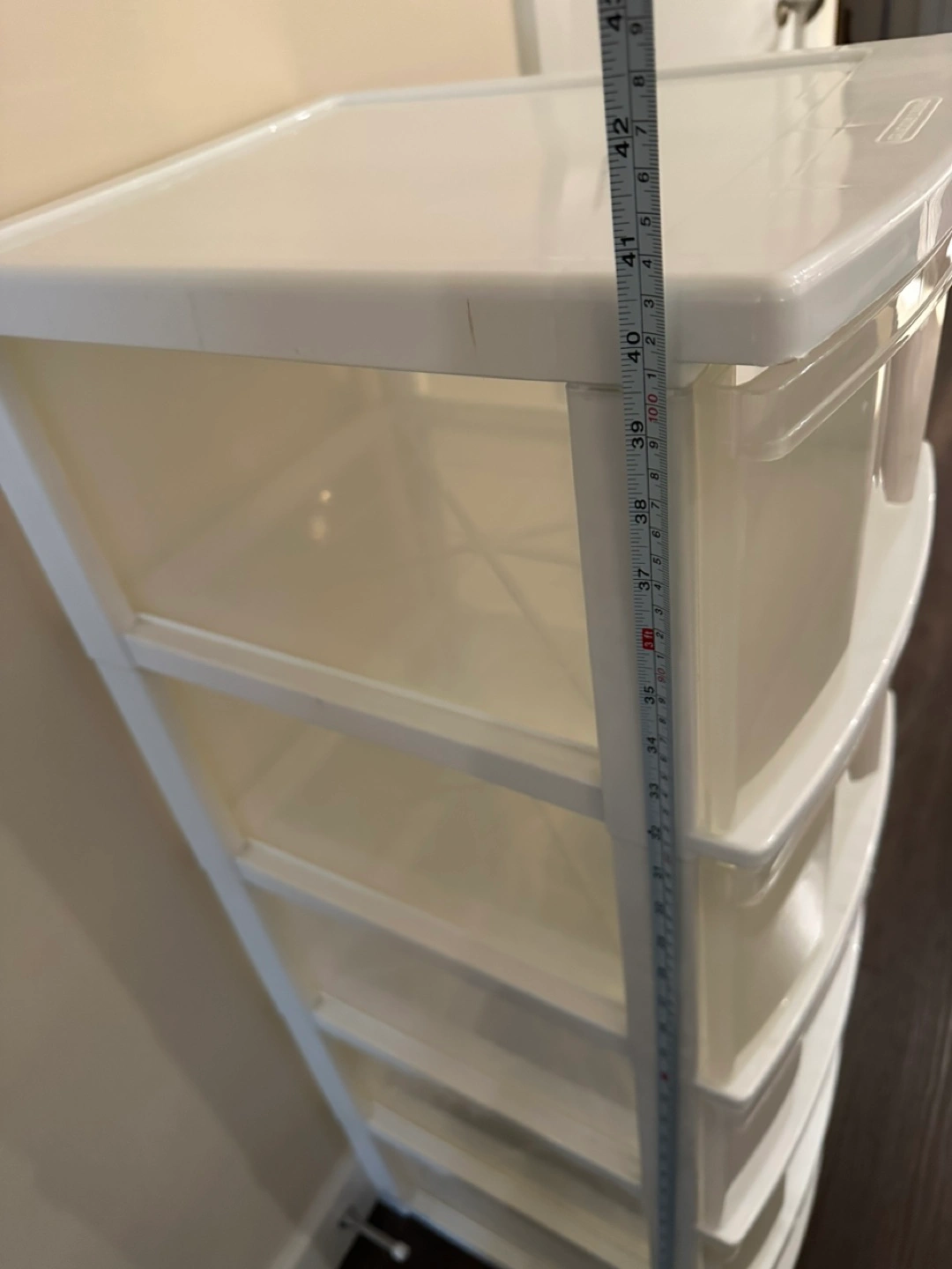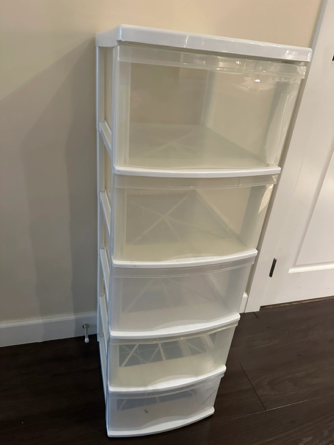 White plastic storage unit. Five clear drawers. Approximately 41”tall.