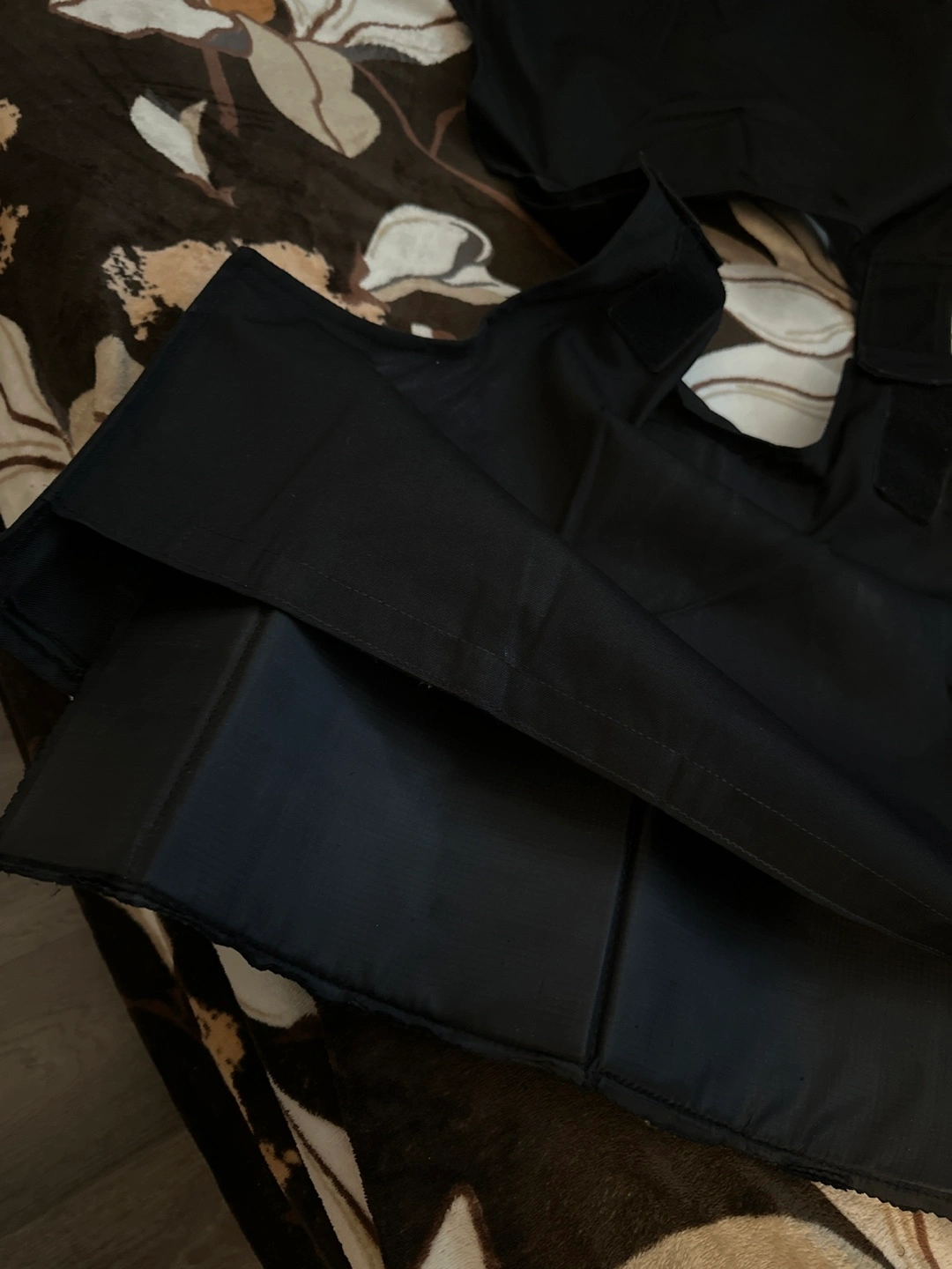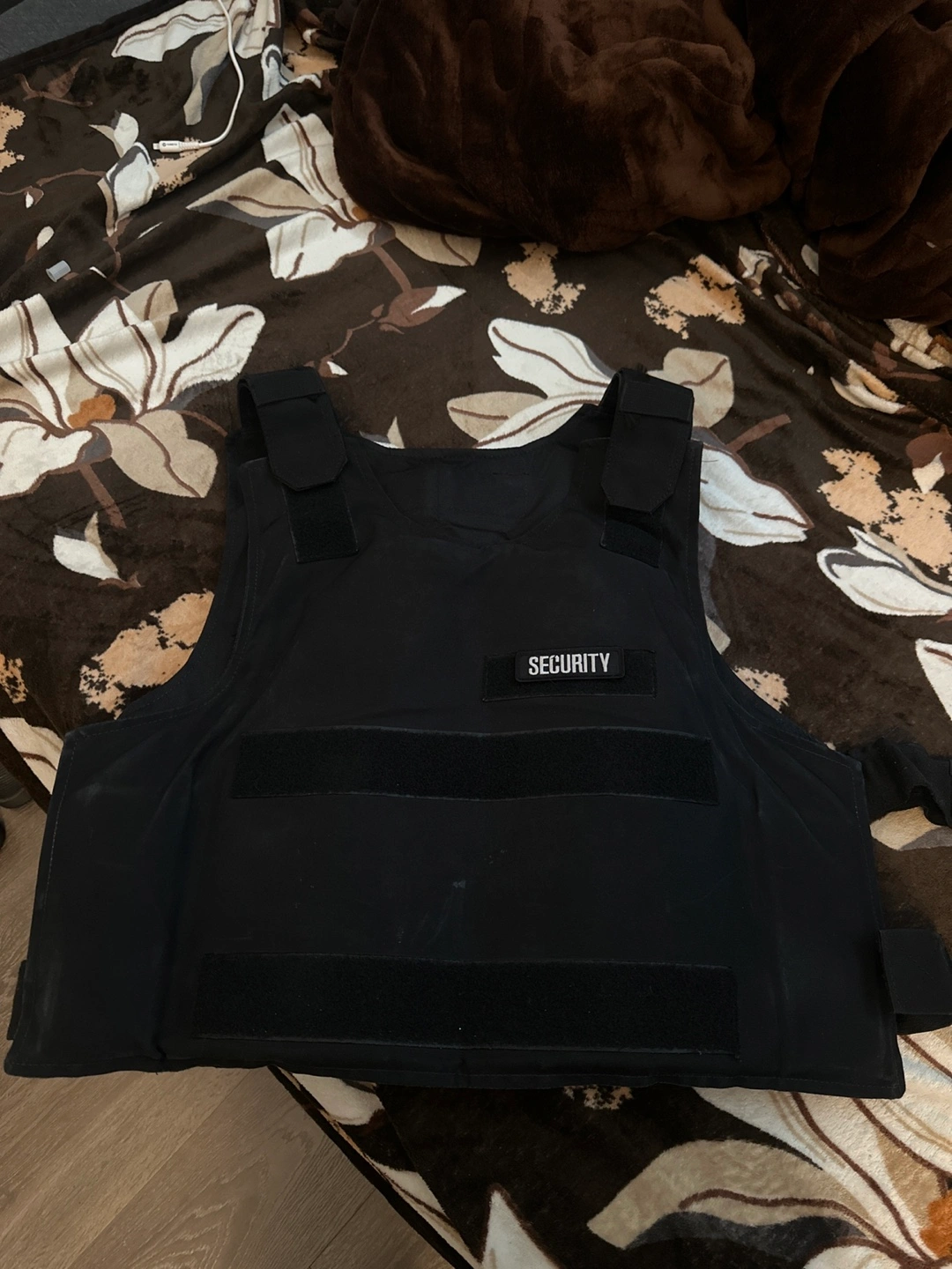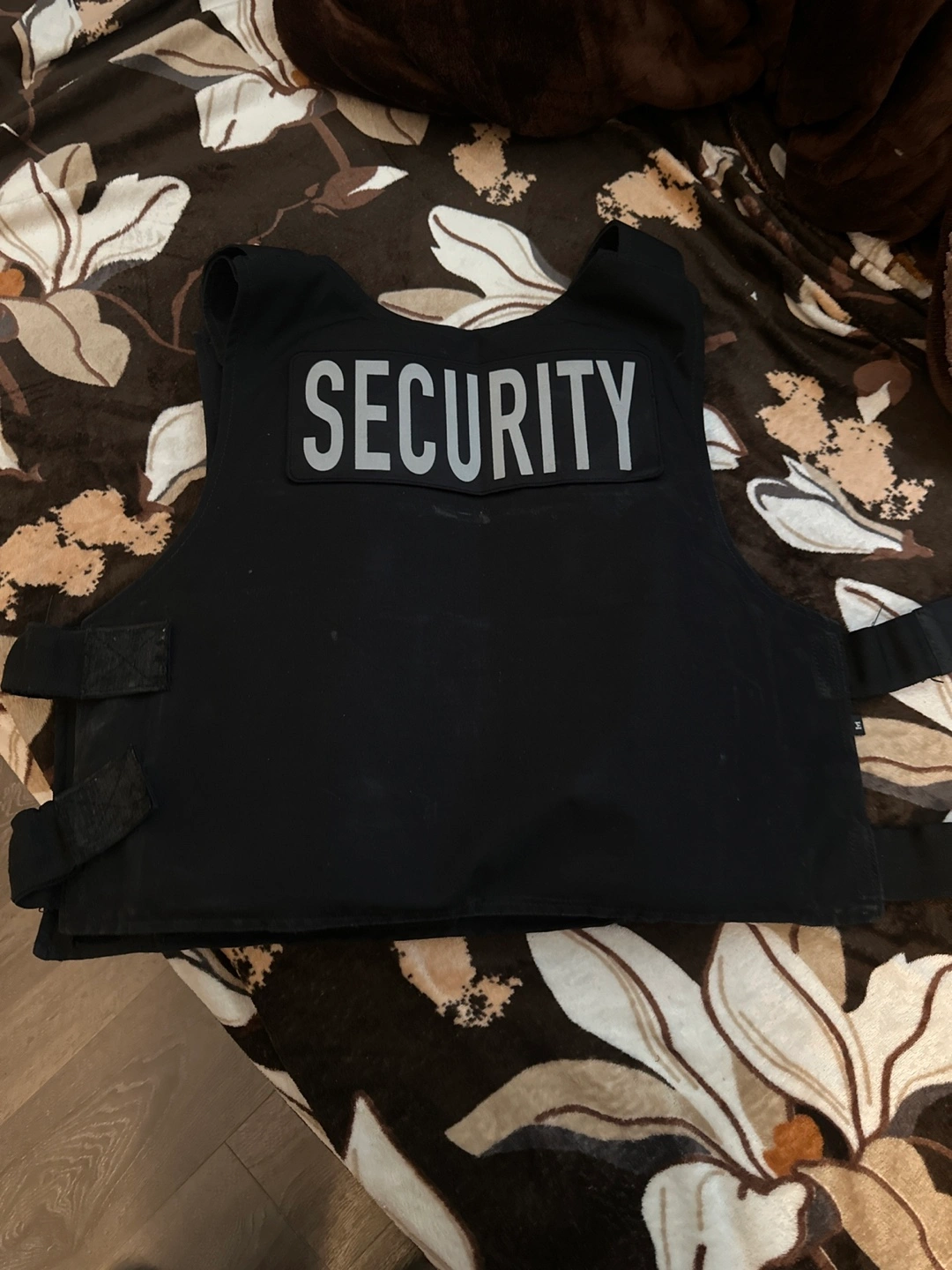 Black security vest. Features adjustable straps and a removable “SECURITY” patch. Good condition with brand new Tactical plates inside the vest.