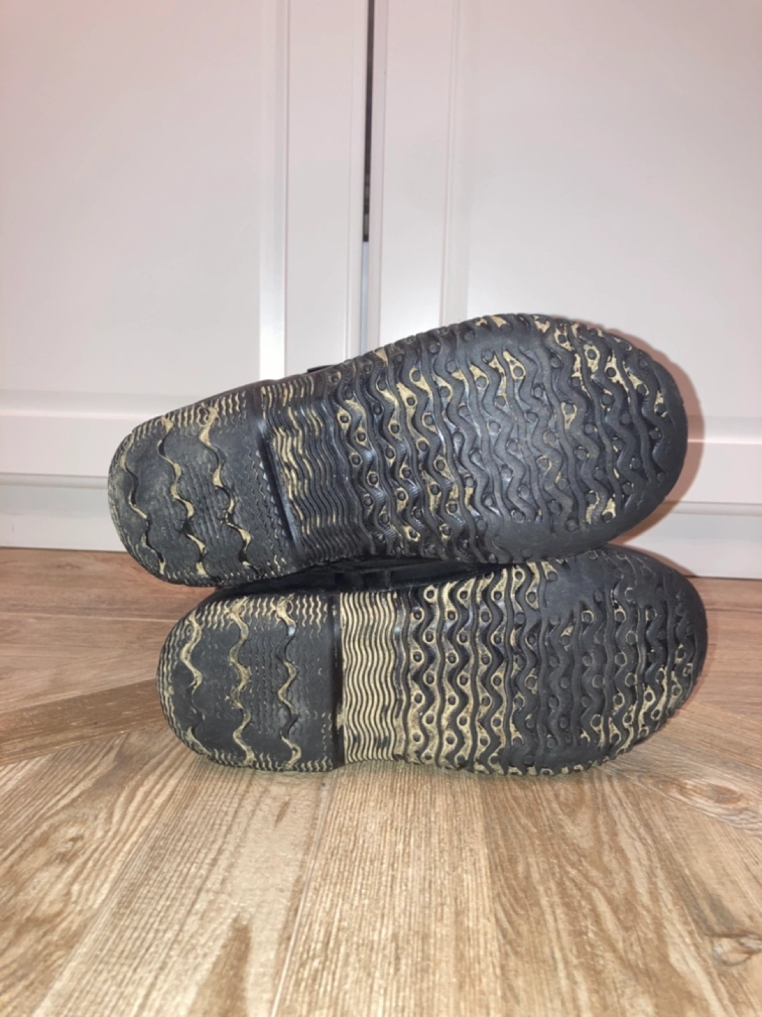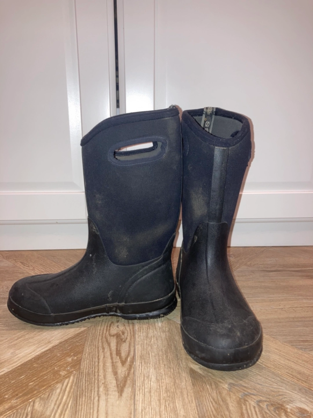 Black rubber winter boots. Youth size 4. Good for rainy or snowy weather. Some wear and tear but grip is still strong.