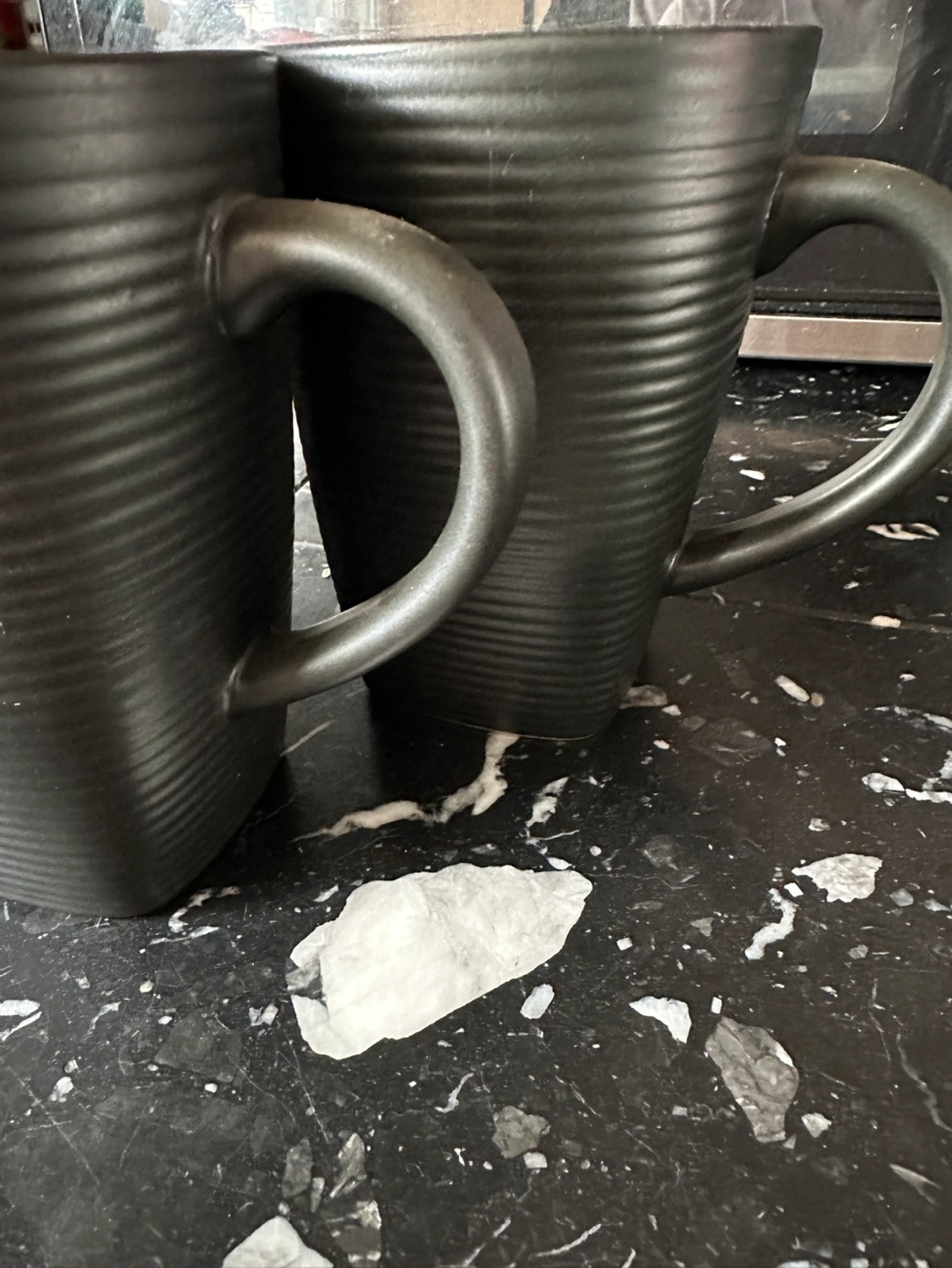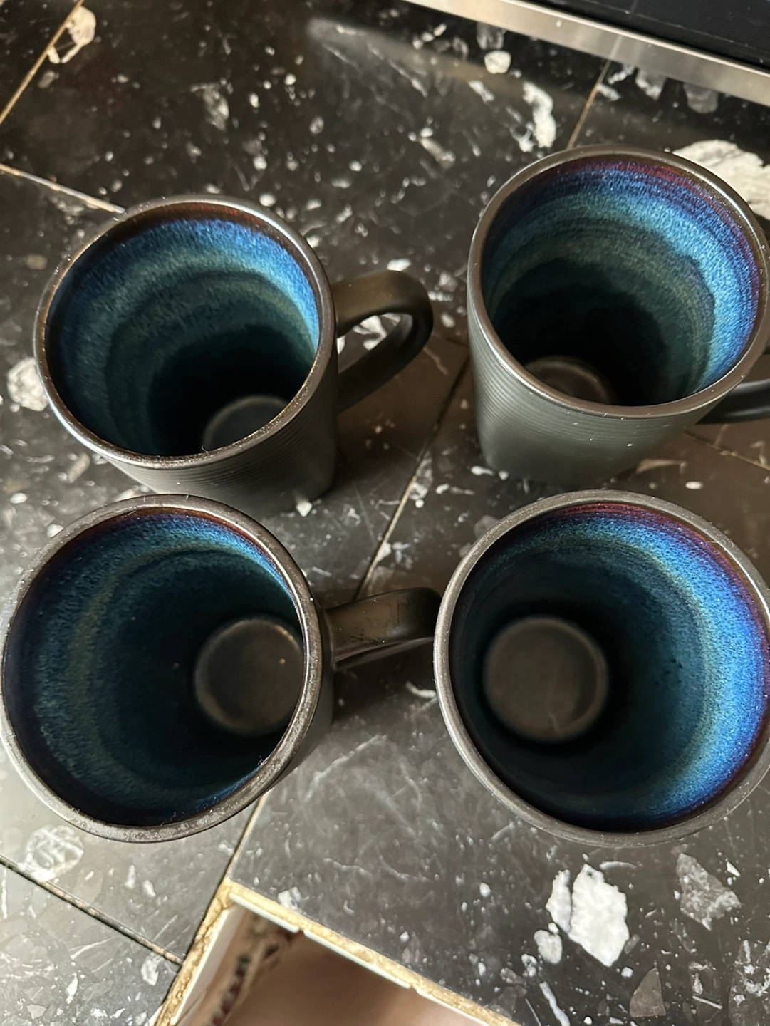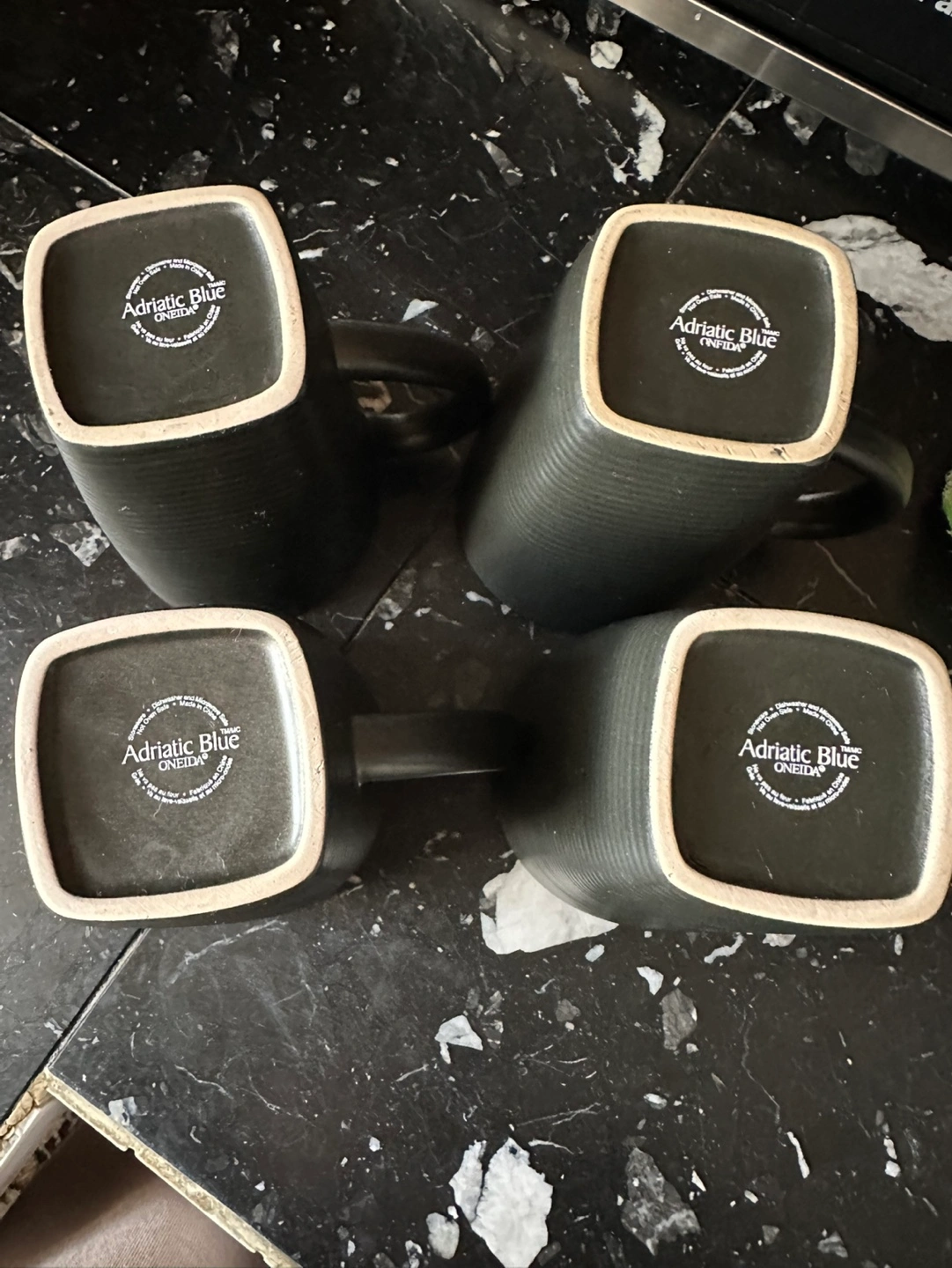 Four black ceramic mugs. Dark blue interior. Textured exterior. Great for coffee or tea. Brand new never used, no chips or cracks, smoke free home. Kitchen cupboard clean out.