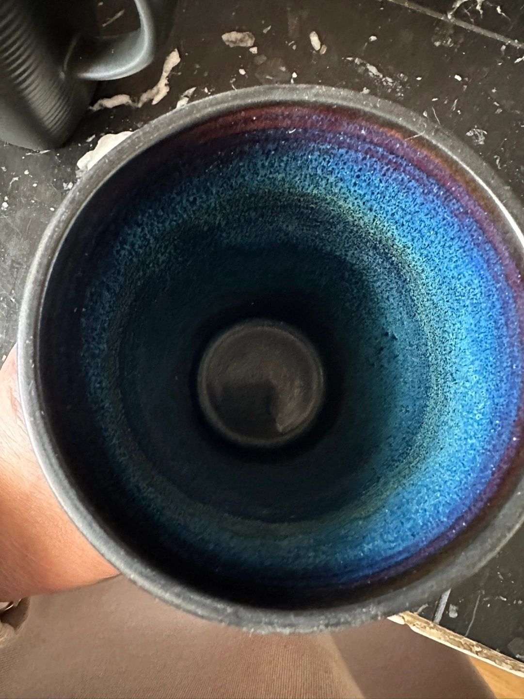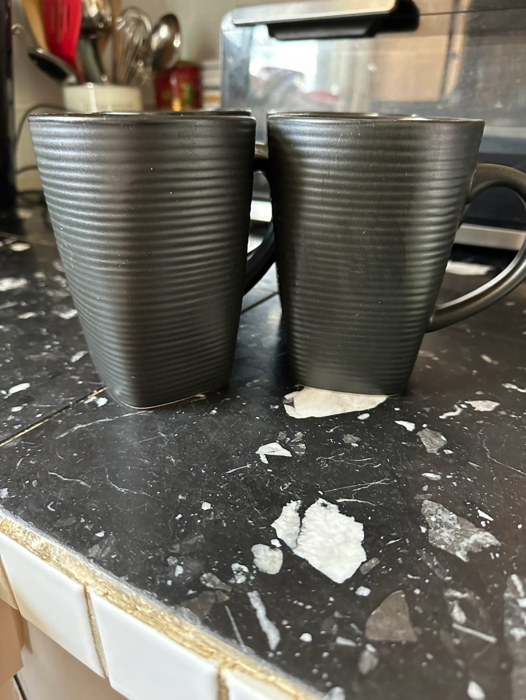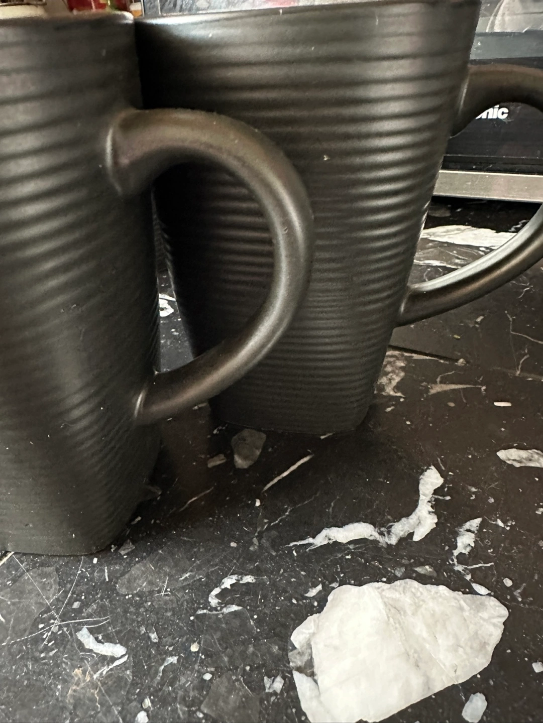 Four black ceramic mugs. Dark blue interior. Textured exterior. Great for coffee or tea. Brand new never used, no chips or cracks, smoke free home. Kitchen cupboard clean out.