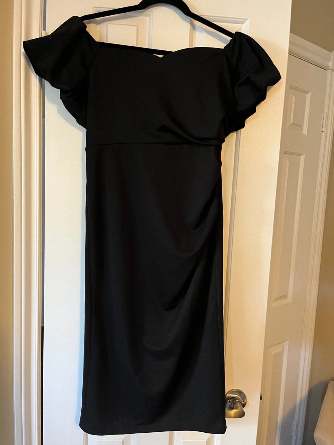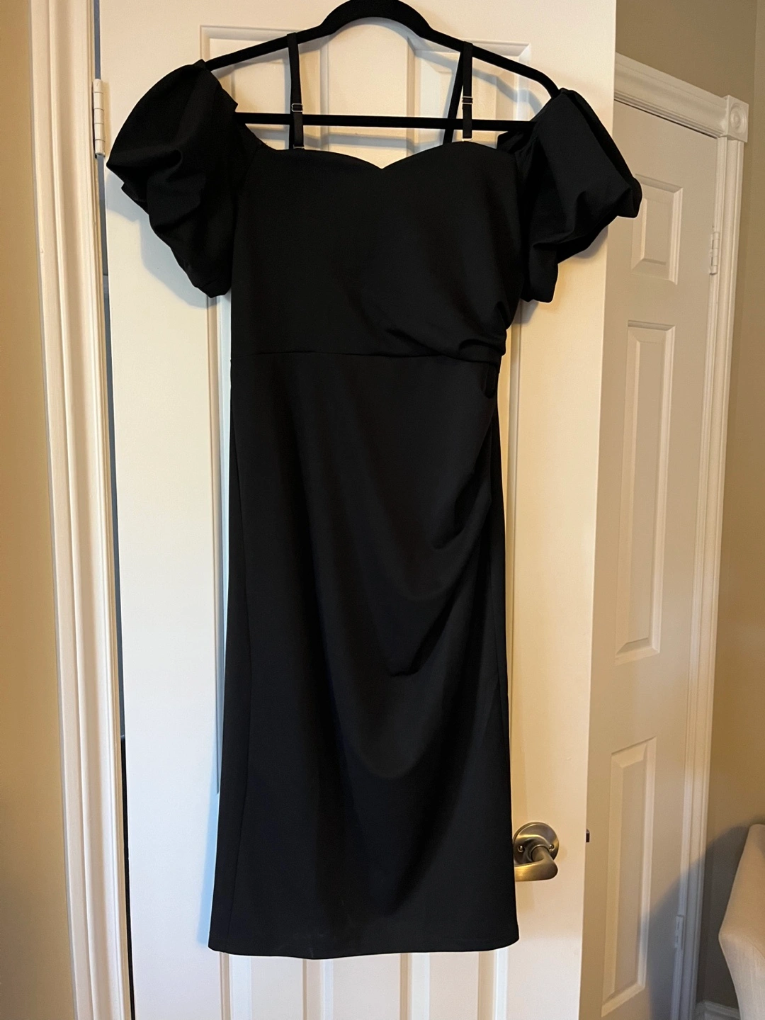 Elegant black midi dress. Off-the-shoulder neckline. Puff sleeves. Fitted silhouette. Perfect for special occasions.
