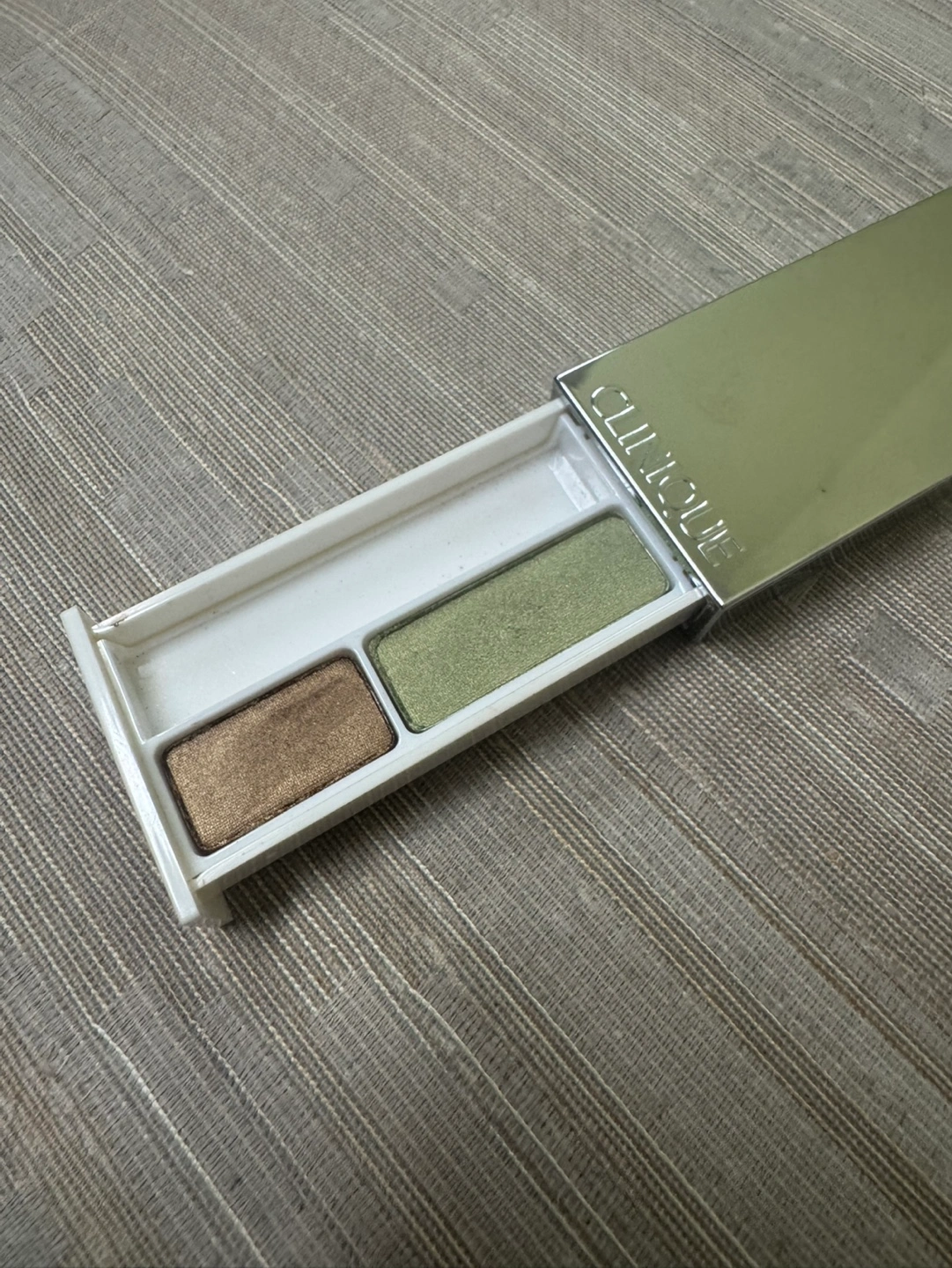 Pre-owned Clinique eyeshadow duo. Two shades included. Compact silver case, mirror like case. Shades are Buttered Toast Bronze and Lemongrass Green with a shimmery finish.