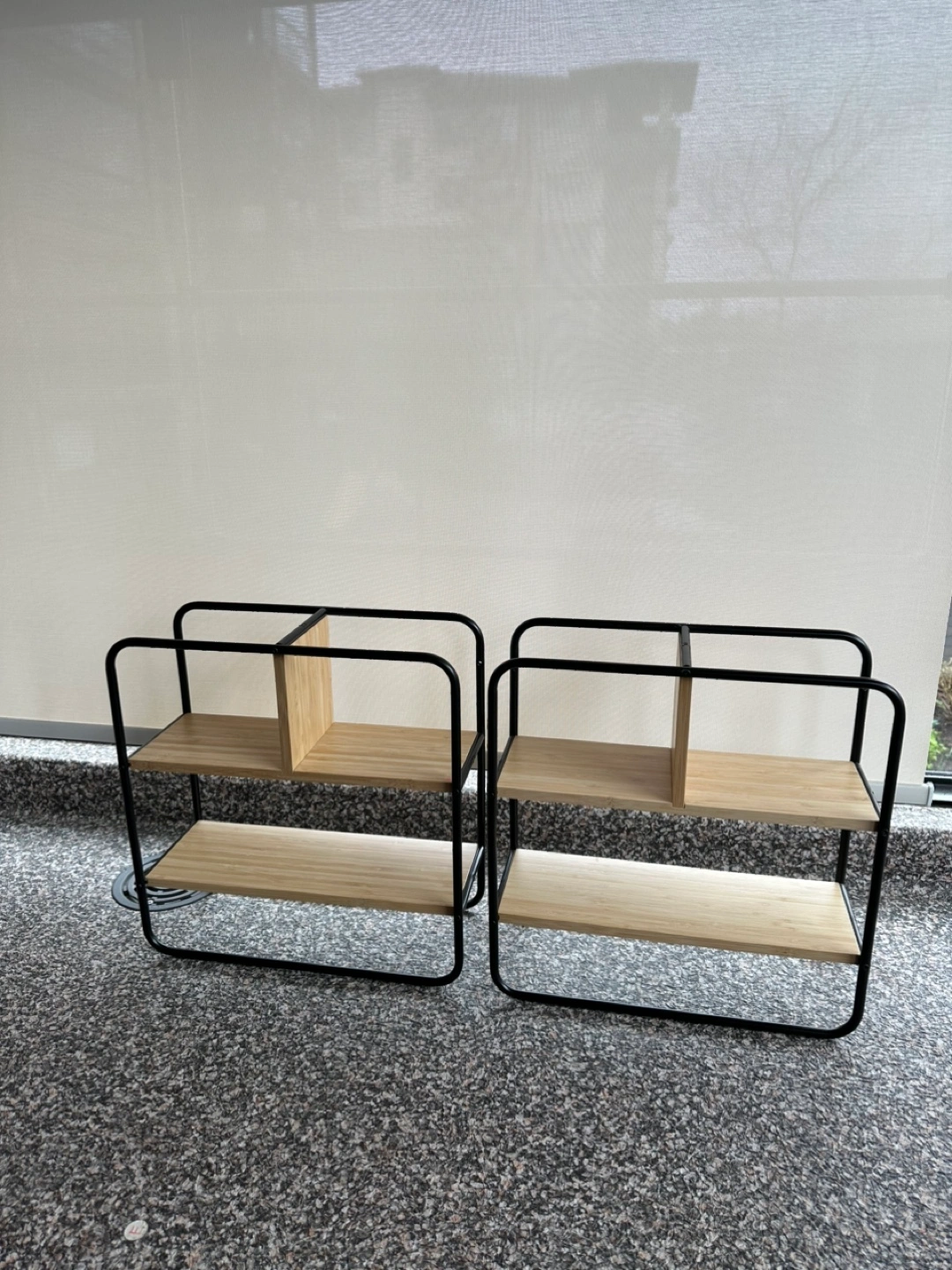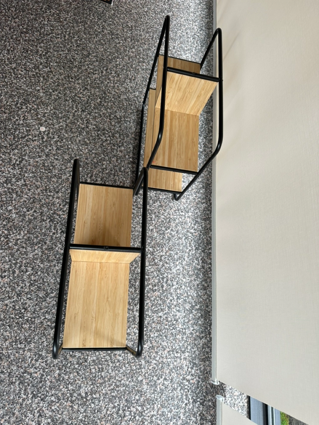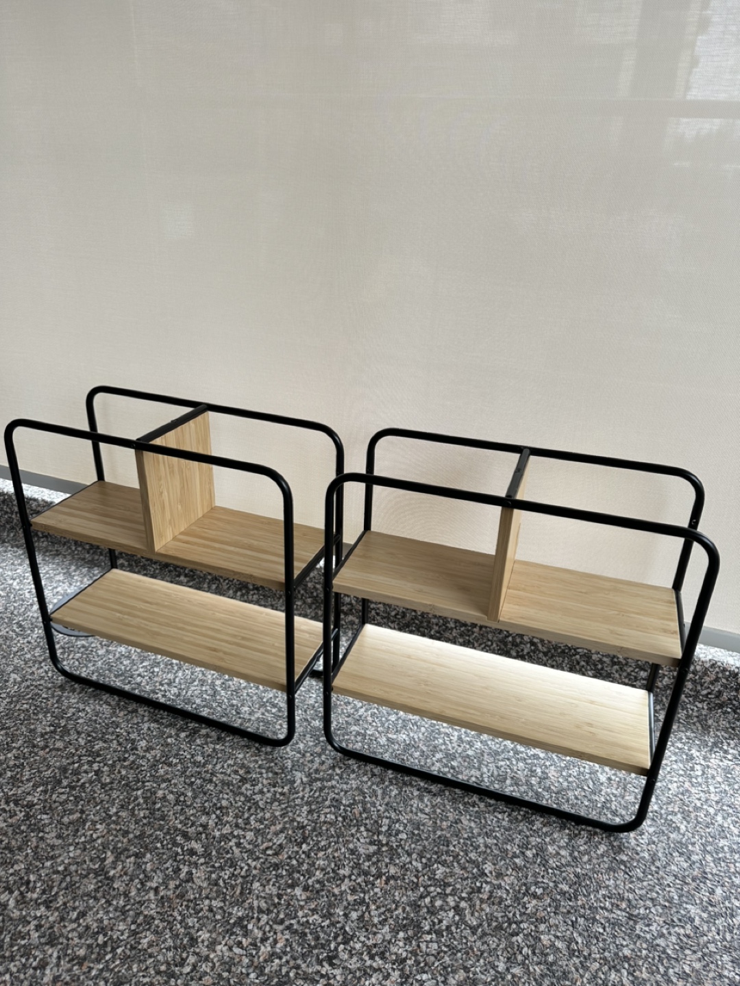 Two small shelves, bamboo and black metal frame. Modern design, great for organizing small spaces. Two for $20.