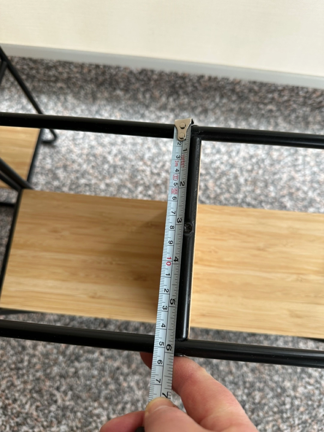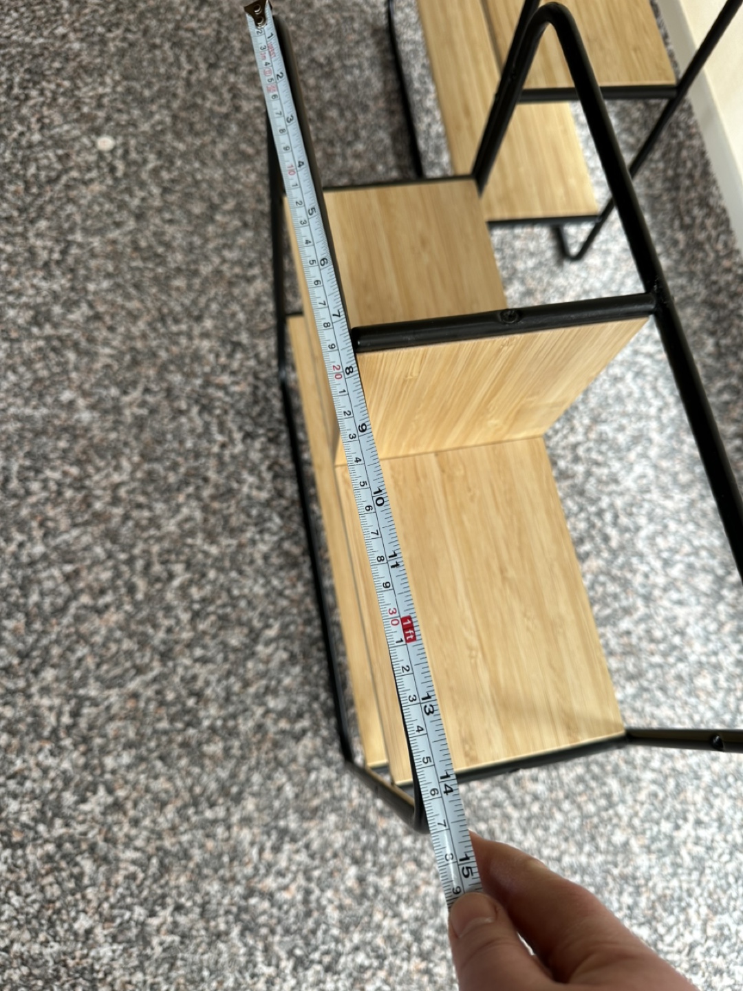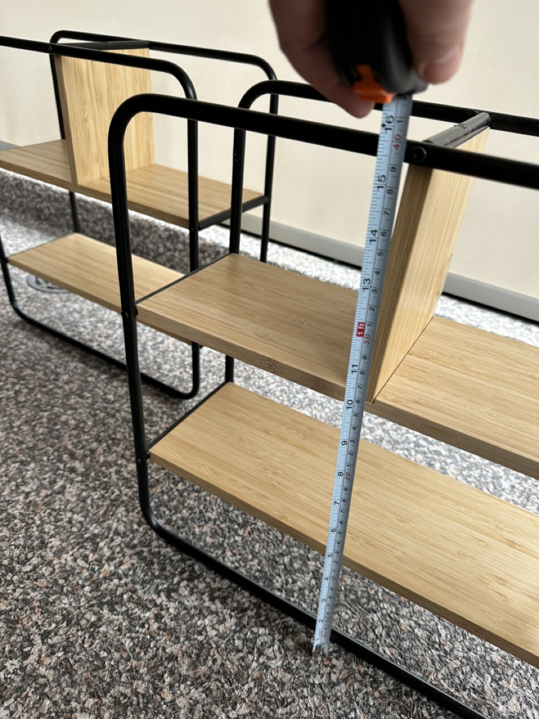 Two small shelves, bamboo and black metal frame. Modern design, great for organizing small spaces. Two for $20.
