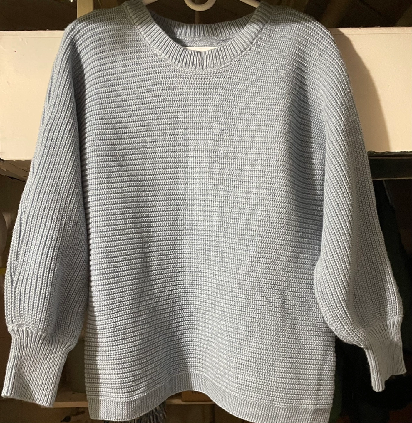 Features a ribbed knit texture and button closure at the back. Long balloon sleeves. Cozy and comfortable.