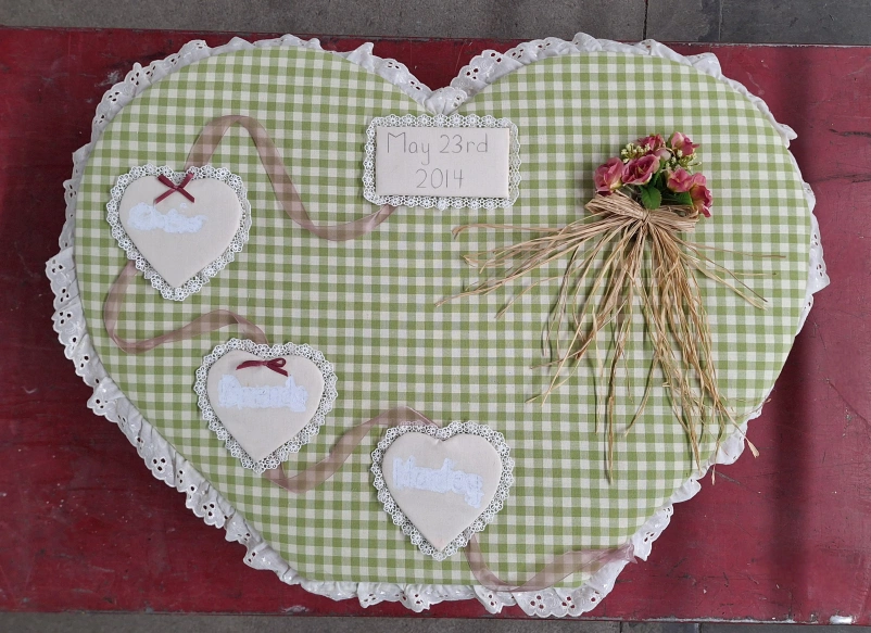 Adorable large handmade heart-shaped wedding cash box/keepsake box. Features three smaller heart name tags, a date label, ribbon, and a dried flower arrangement. Light green gingham fabric with white lace trim.