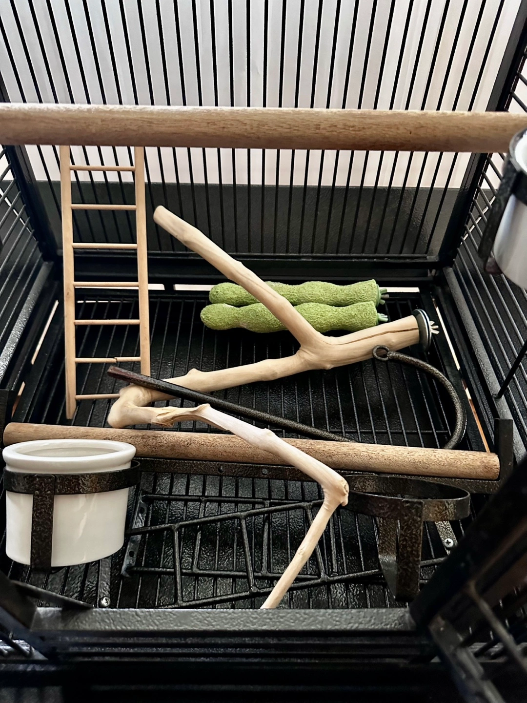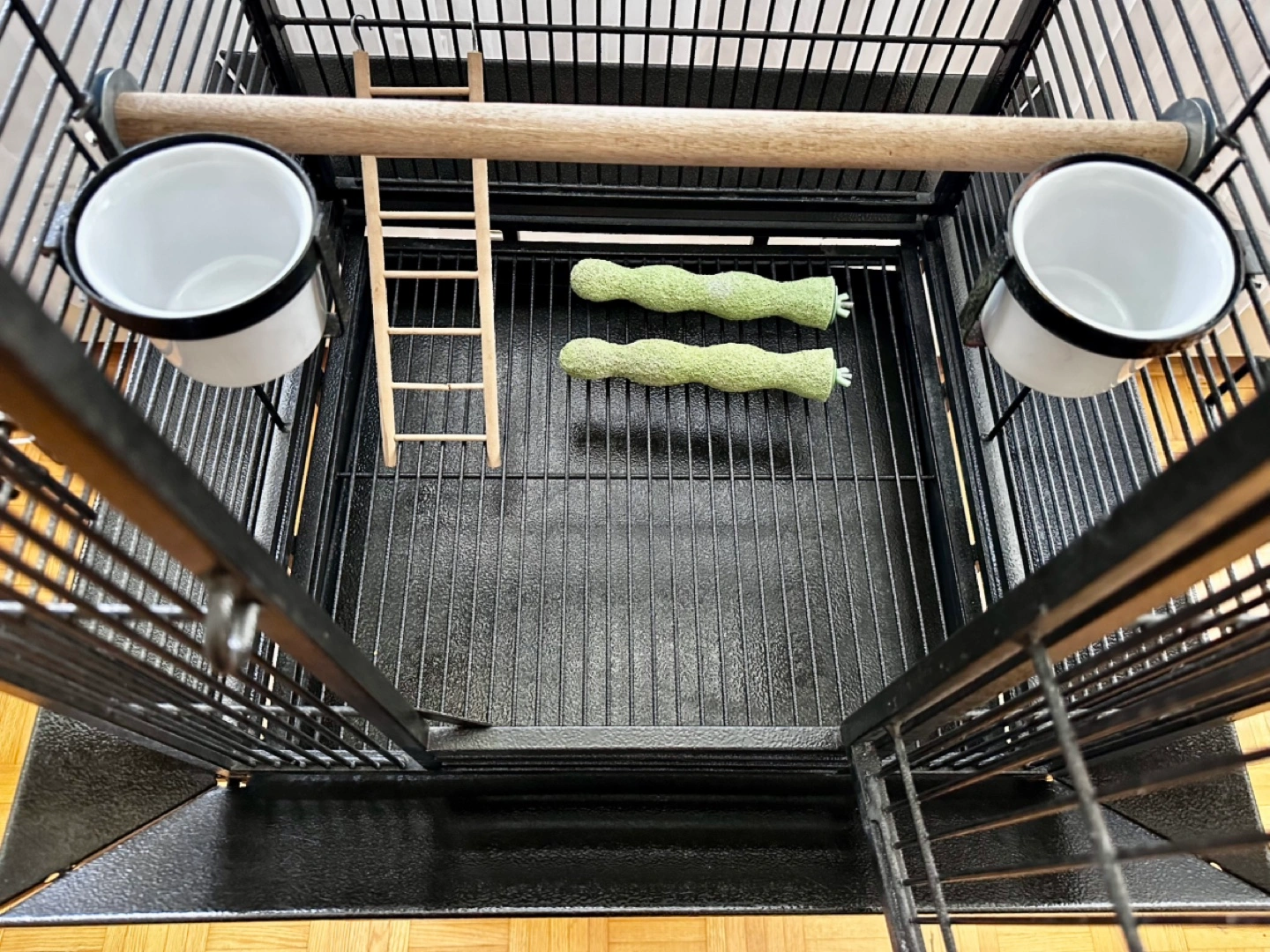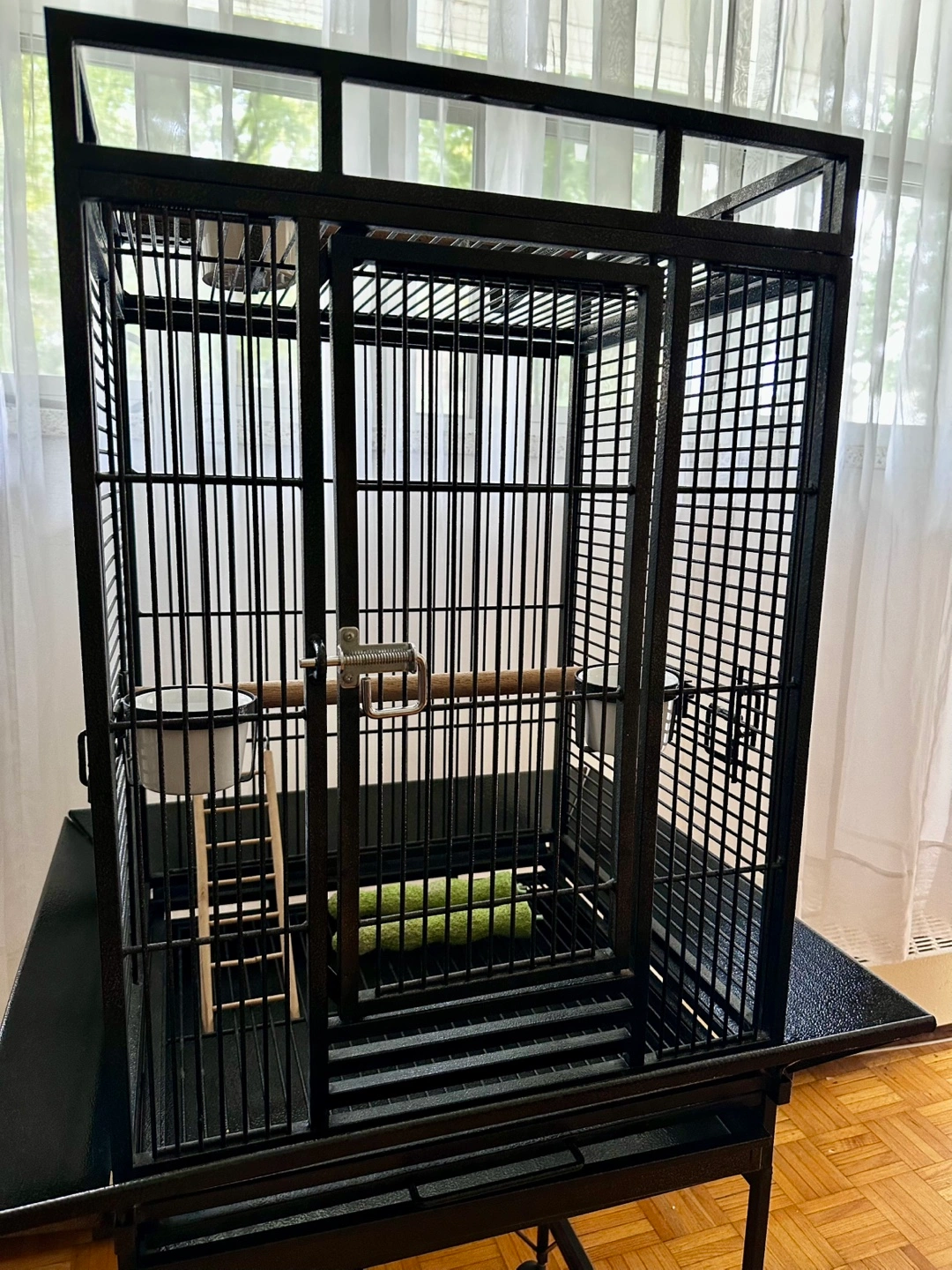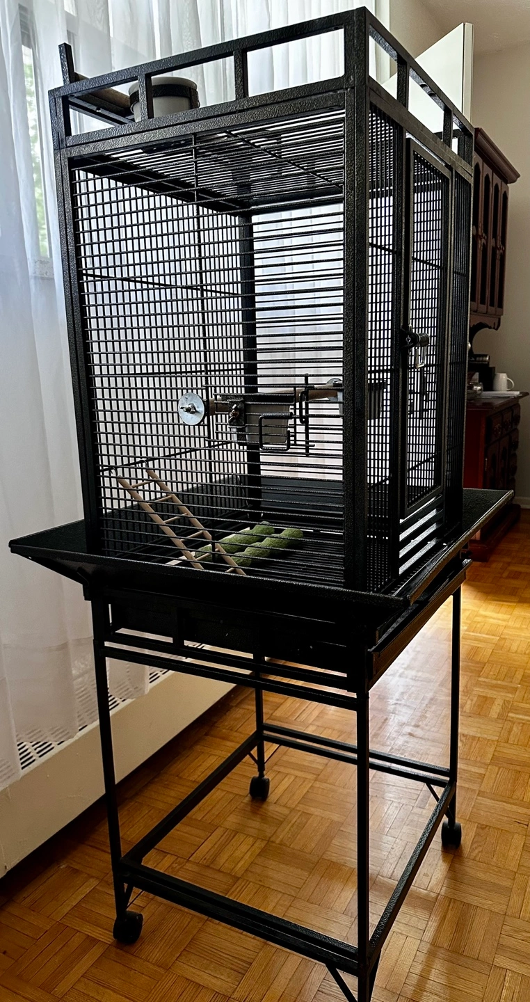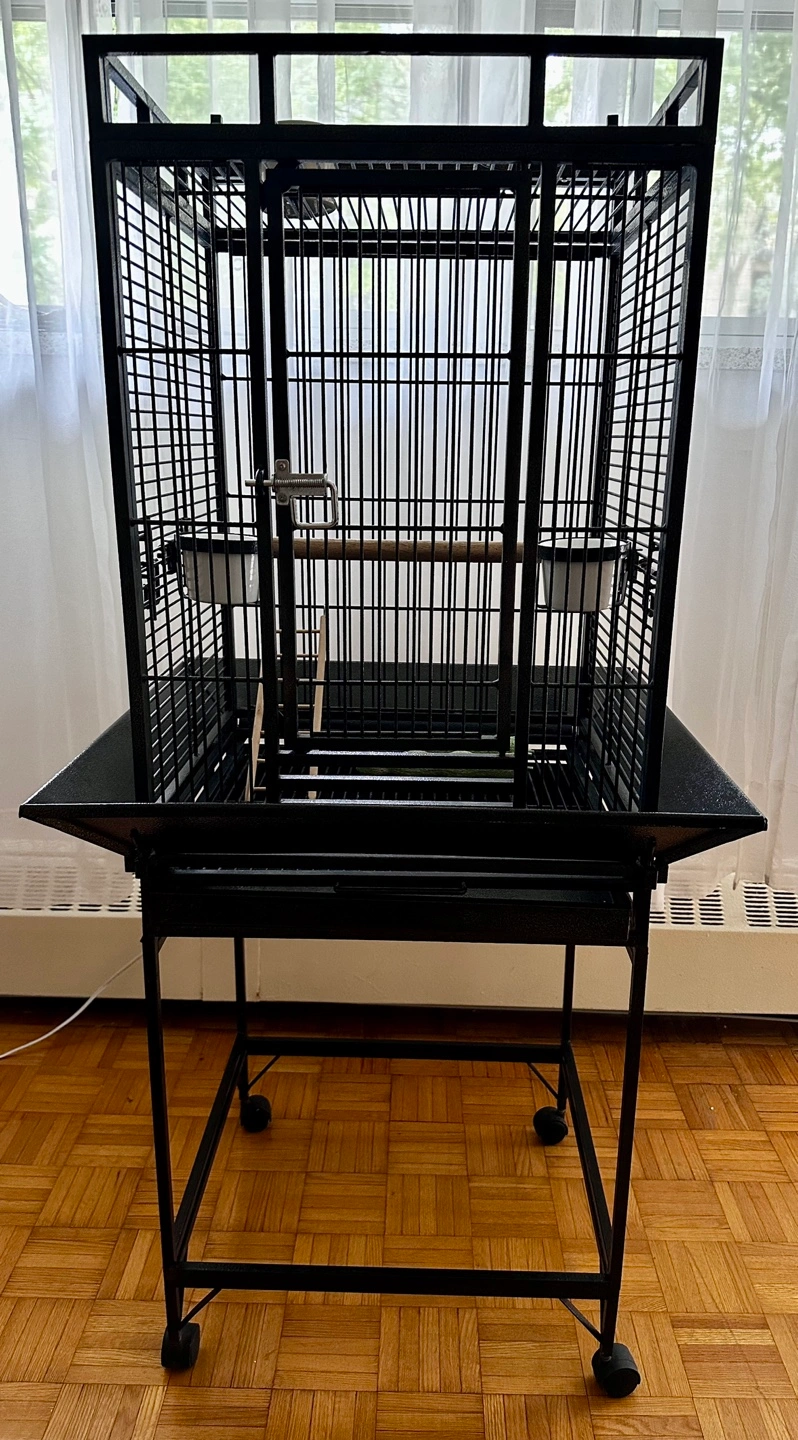Spacious black metal bird cage. Includes stand with wheels. I am including multiple perches and food/water dishes.