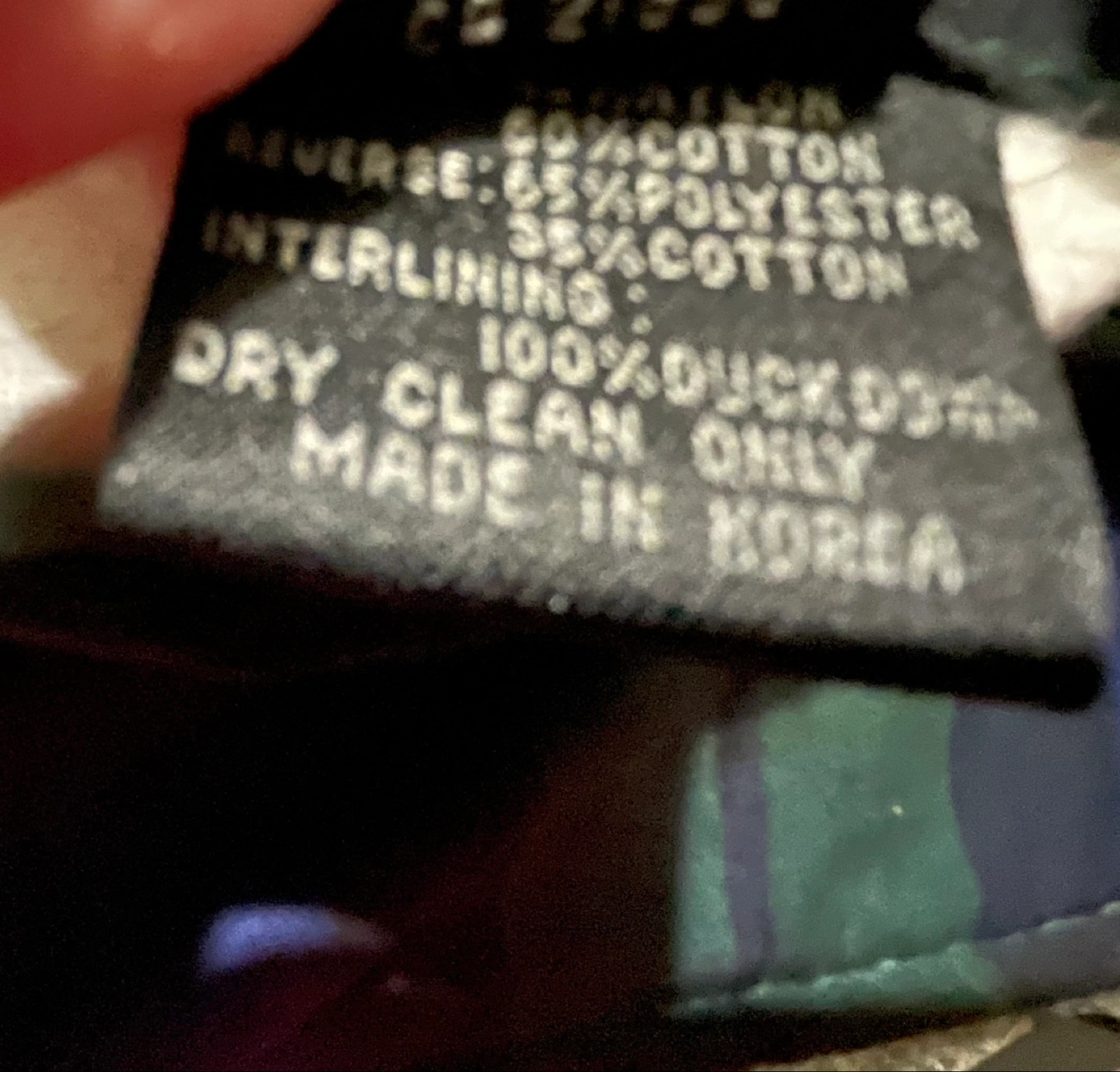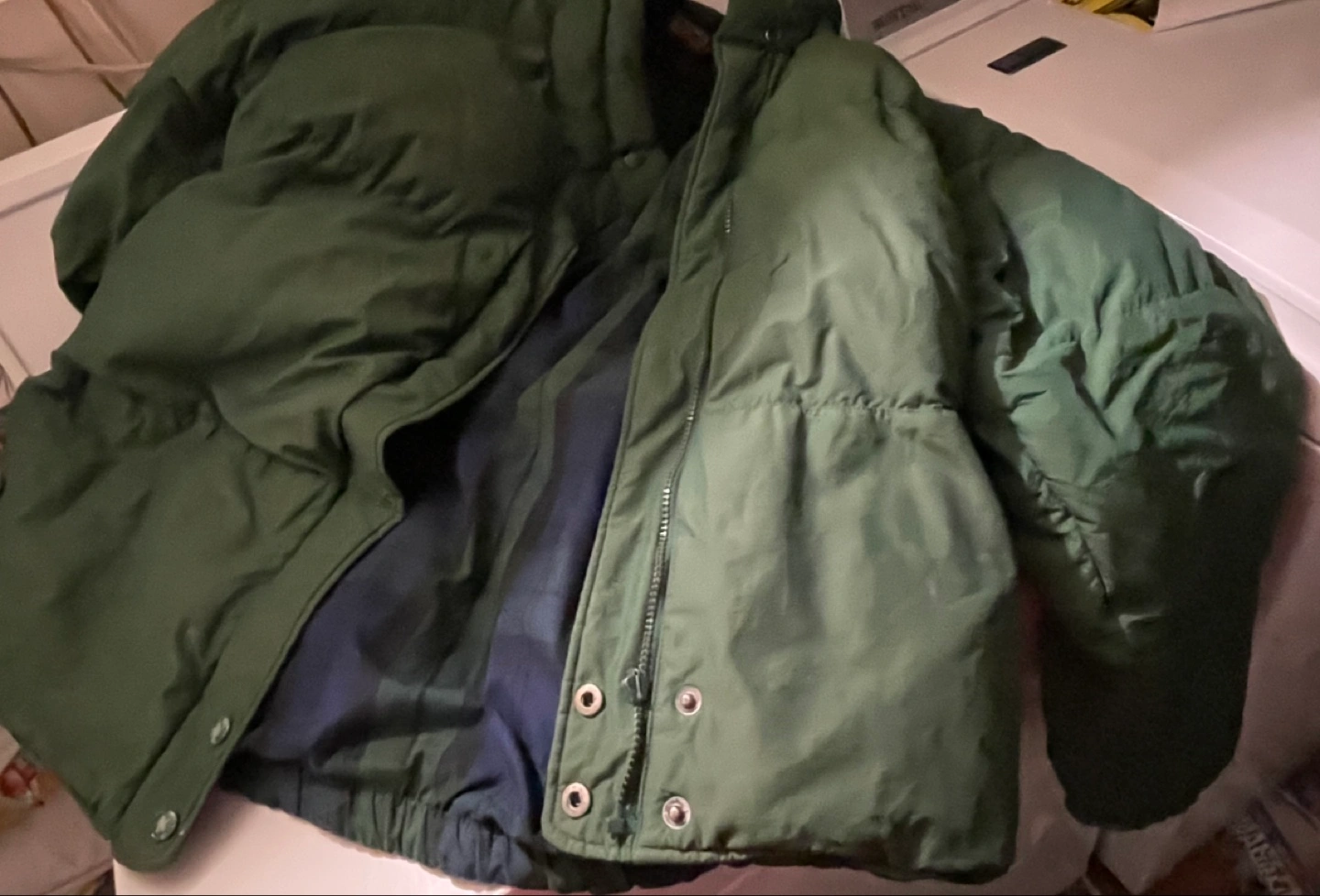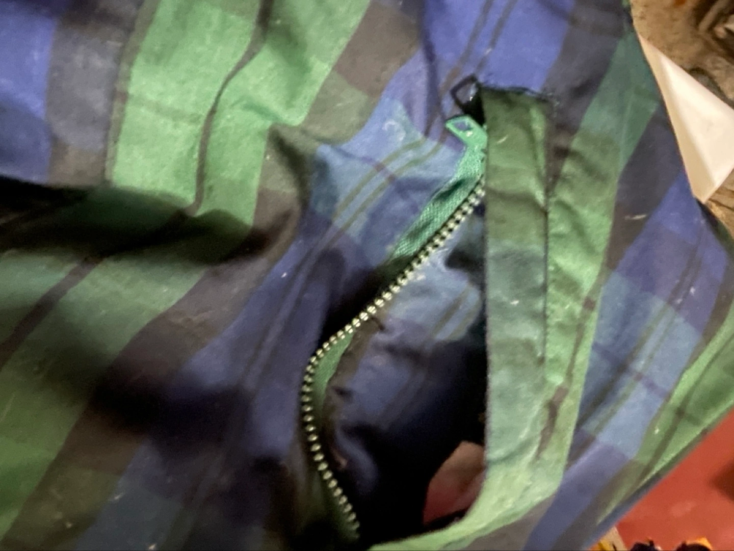 One side dark green, the other a blue and green plaid. XL/TG size. I have washed it works well. There is a small repair and zipper needs the thingy to pull up