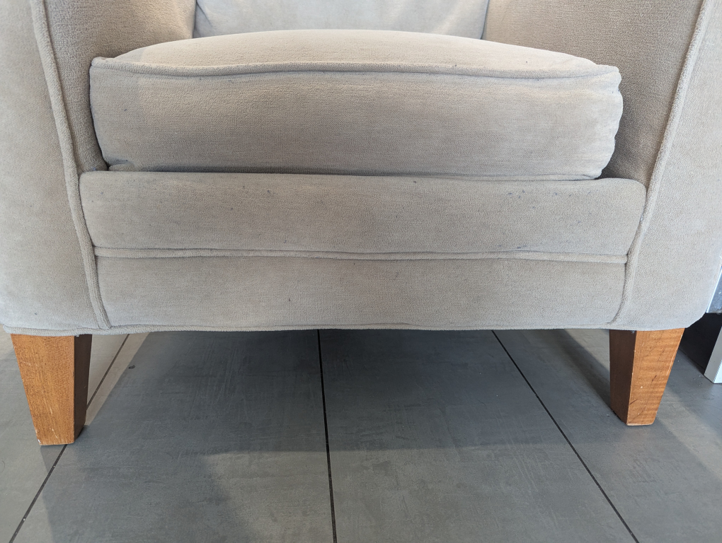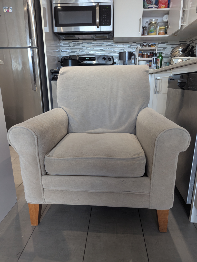 Very Comfortable loveseat, light beige fabric. Wooden legs. Great addition to living room or Gives very good neck support . Only reason for sellers is we got a new sofa