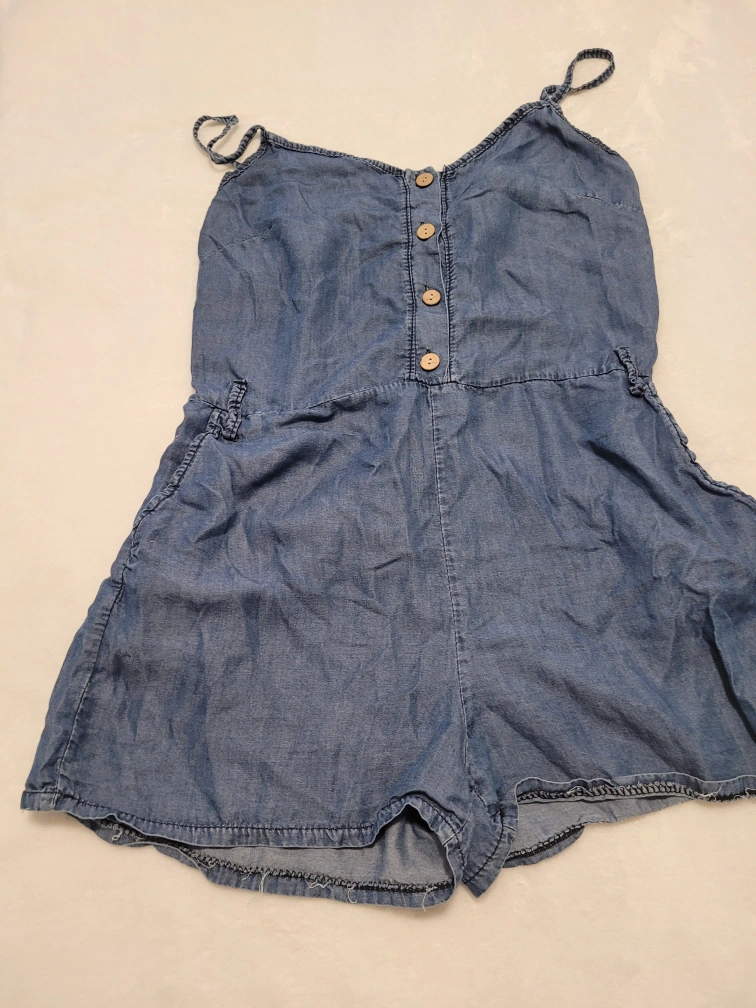 Adorable denim jumpsuit. Features button-front closure, thin straps, and pockets. Also included, a vibrant royal blue asymmetrical skirt. Both for 8$