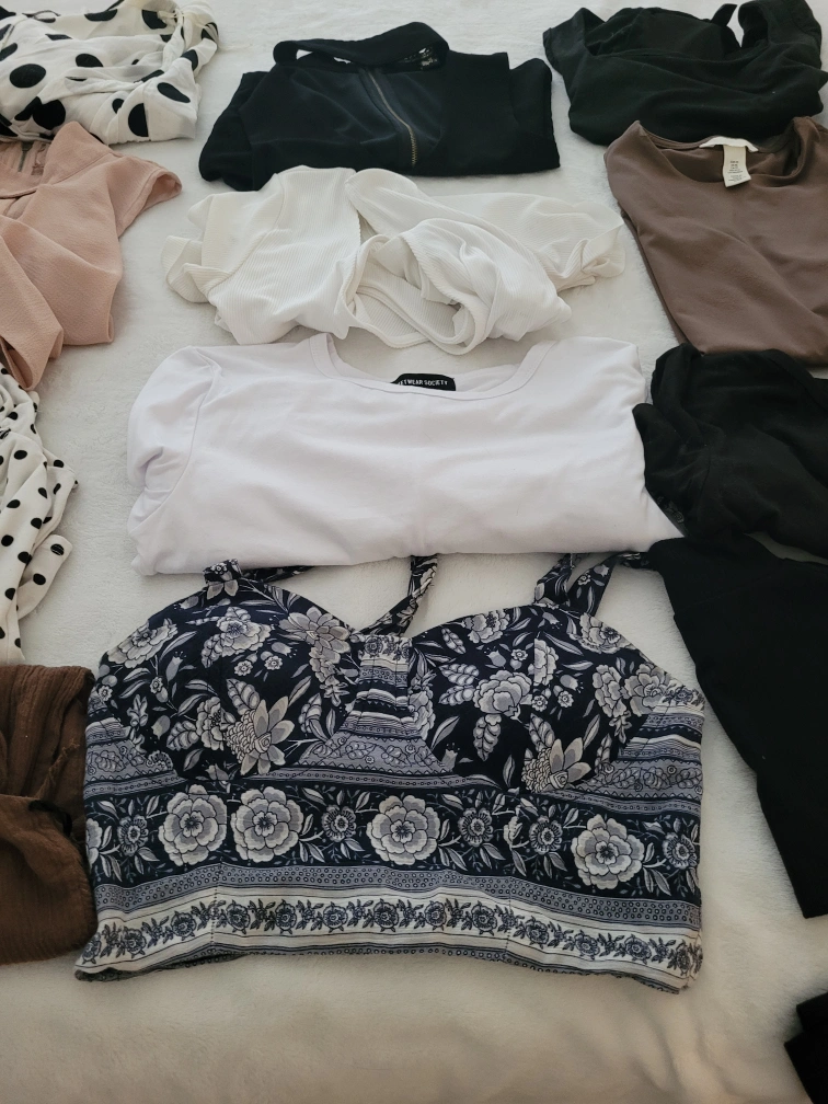 Large bundle of tops. Various colours and patterns. Includes several black tops, white tops, and patterned tops. Some are sleeveless, some have sleeves.