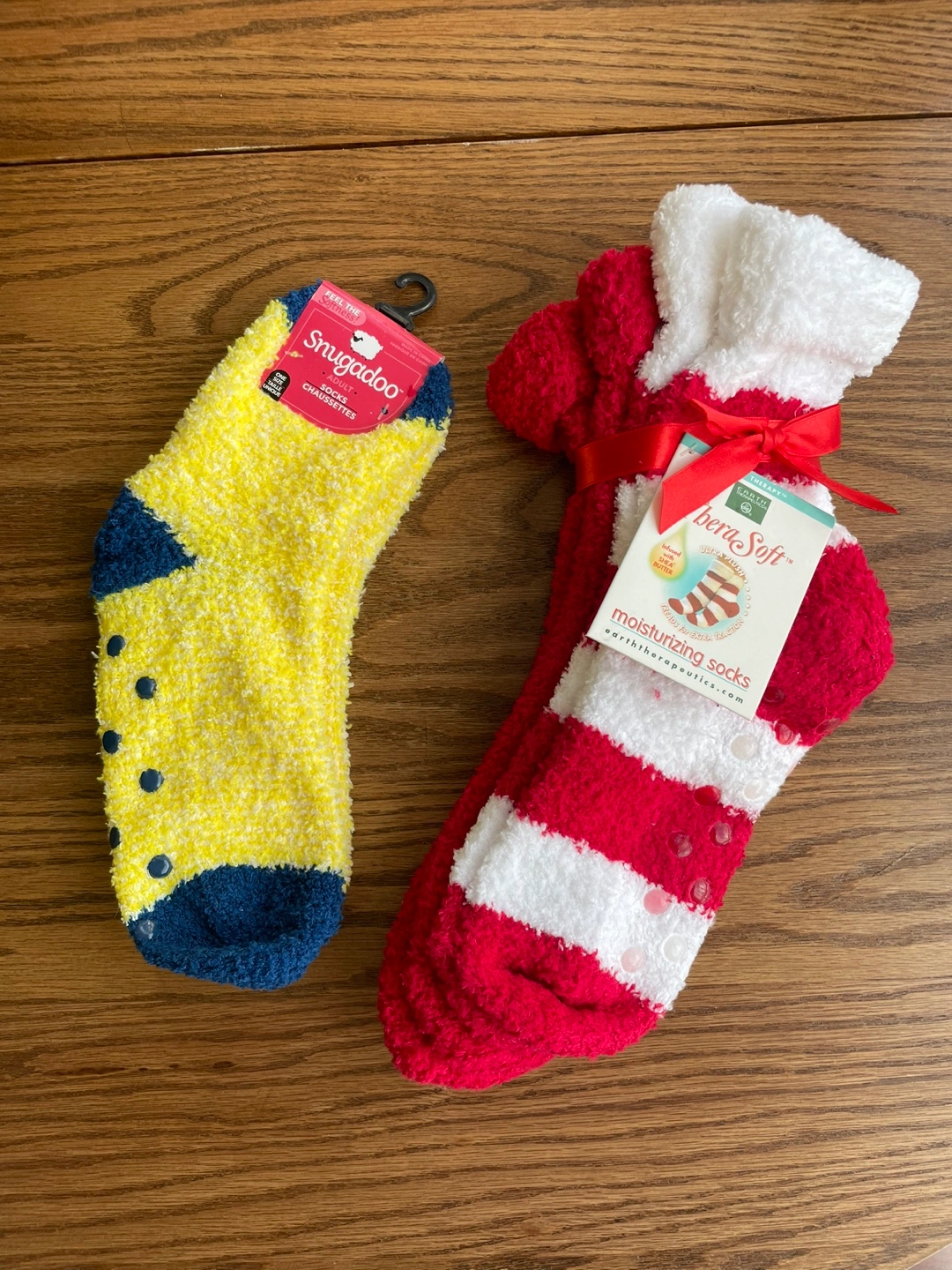 Two pairs of fuzzy socks. One yellow and navy blue pair from Snugadoo. One red and white striped pair from Earth Therapeutics. Grippers on the bottom of both pairs.