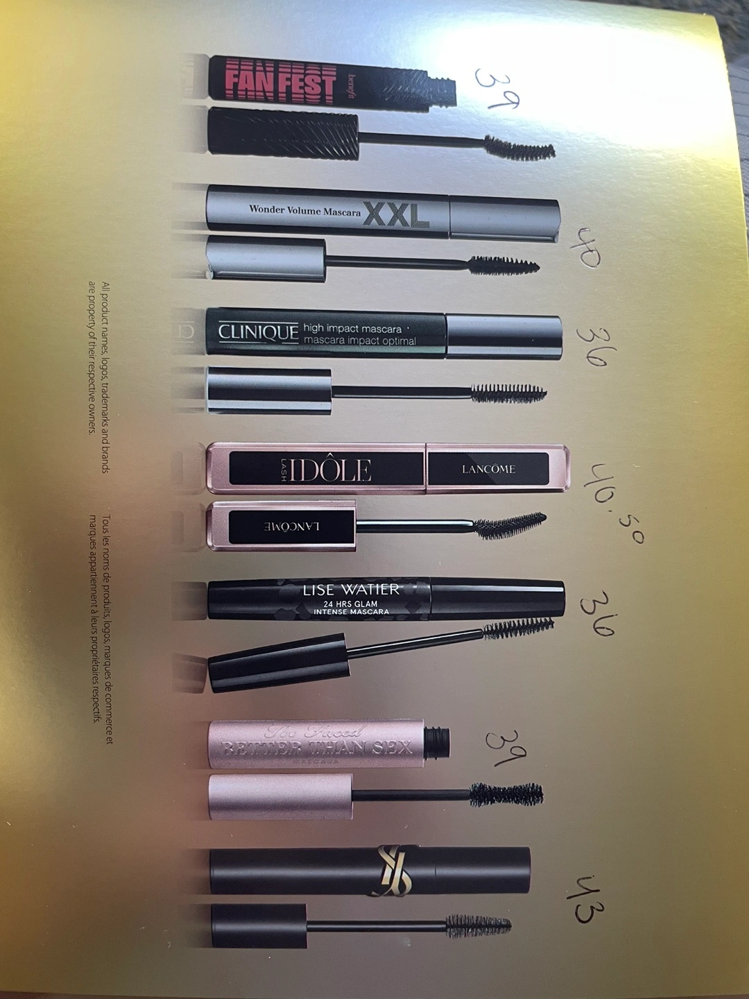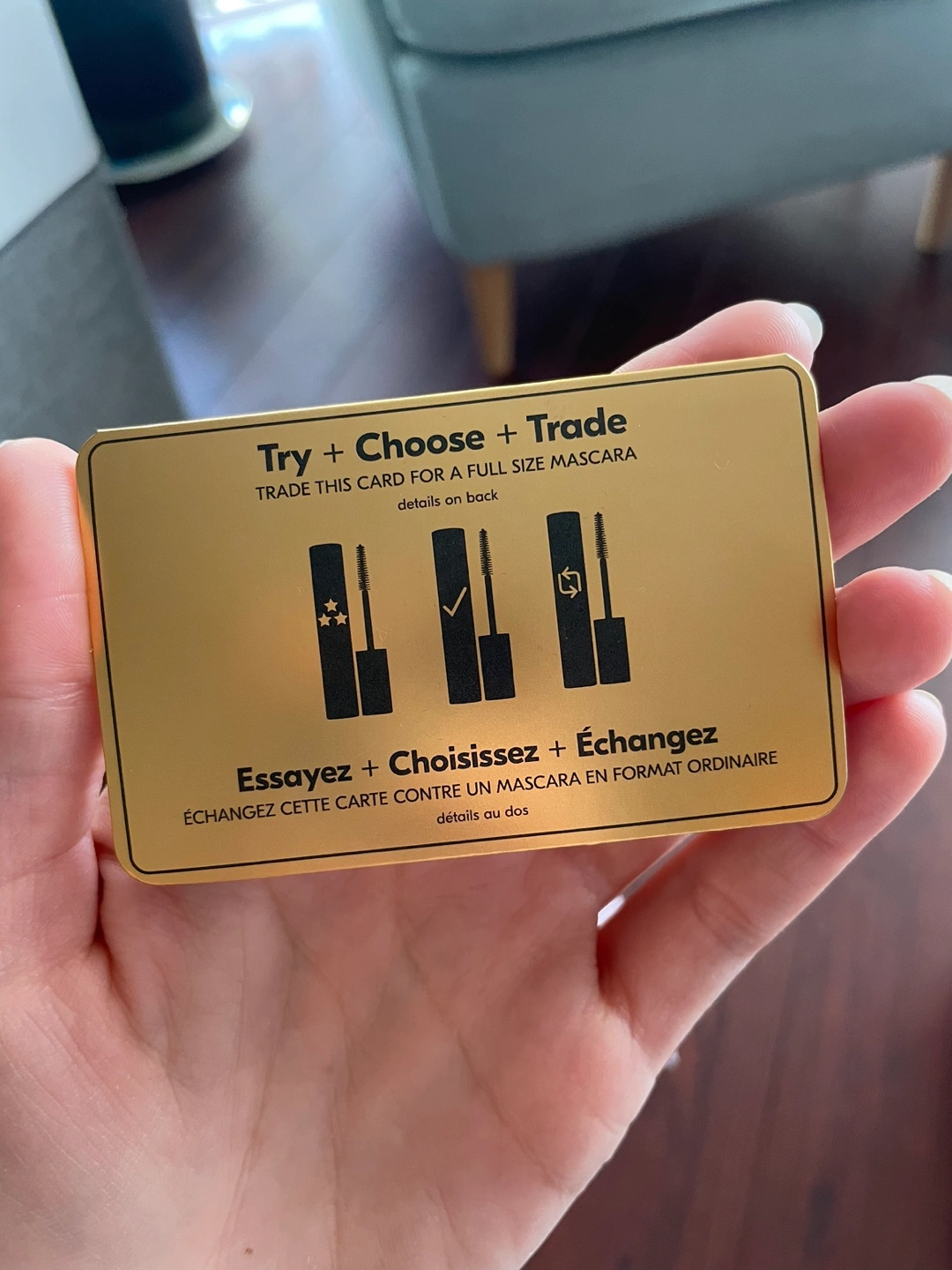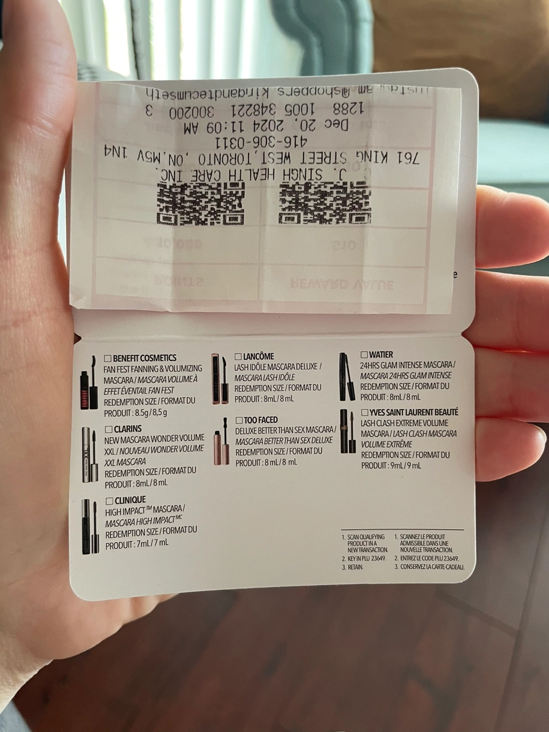 Gold card allows you to redeem for a full-size mascara from Shoppers Drug Mart - Includes samples from Benefit, Lancôme, Too Faced, Clinique, and Lise Watier. Redemption details on back.