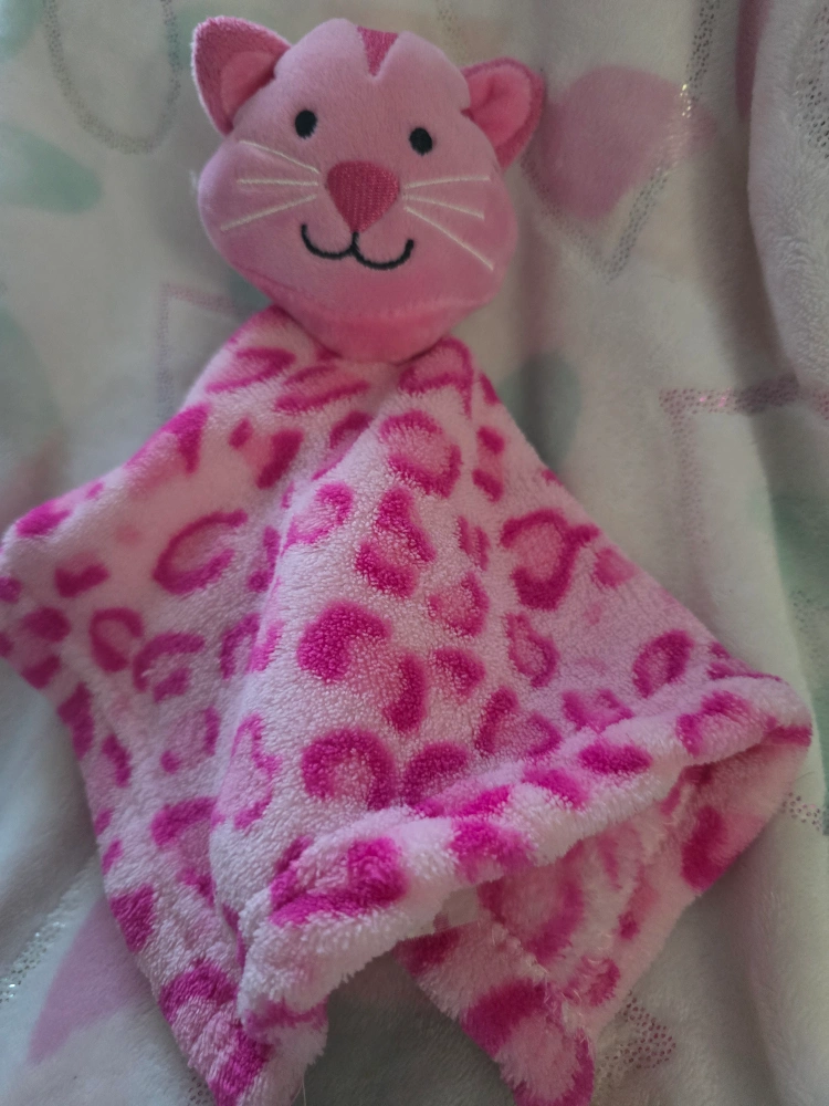 Adorable pink security blanket. Features a cute cat face and soft pink leopard print. Perfect for baby.