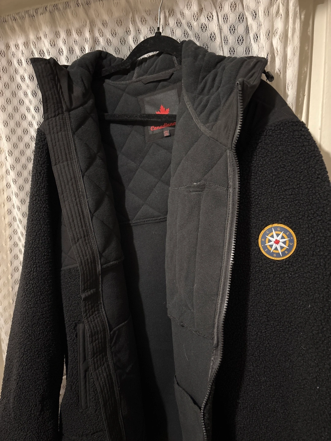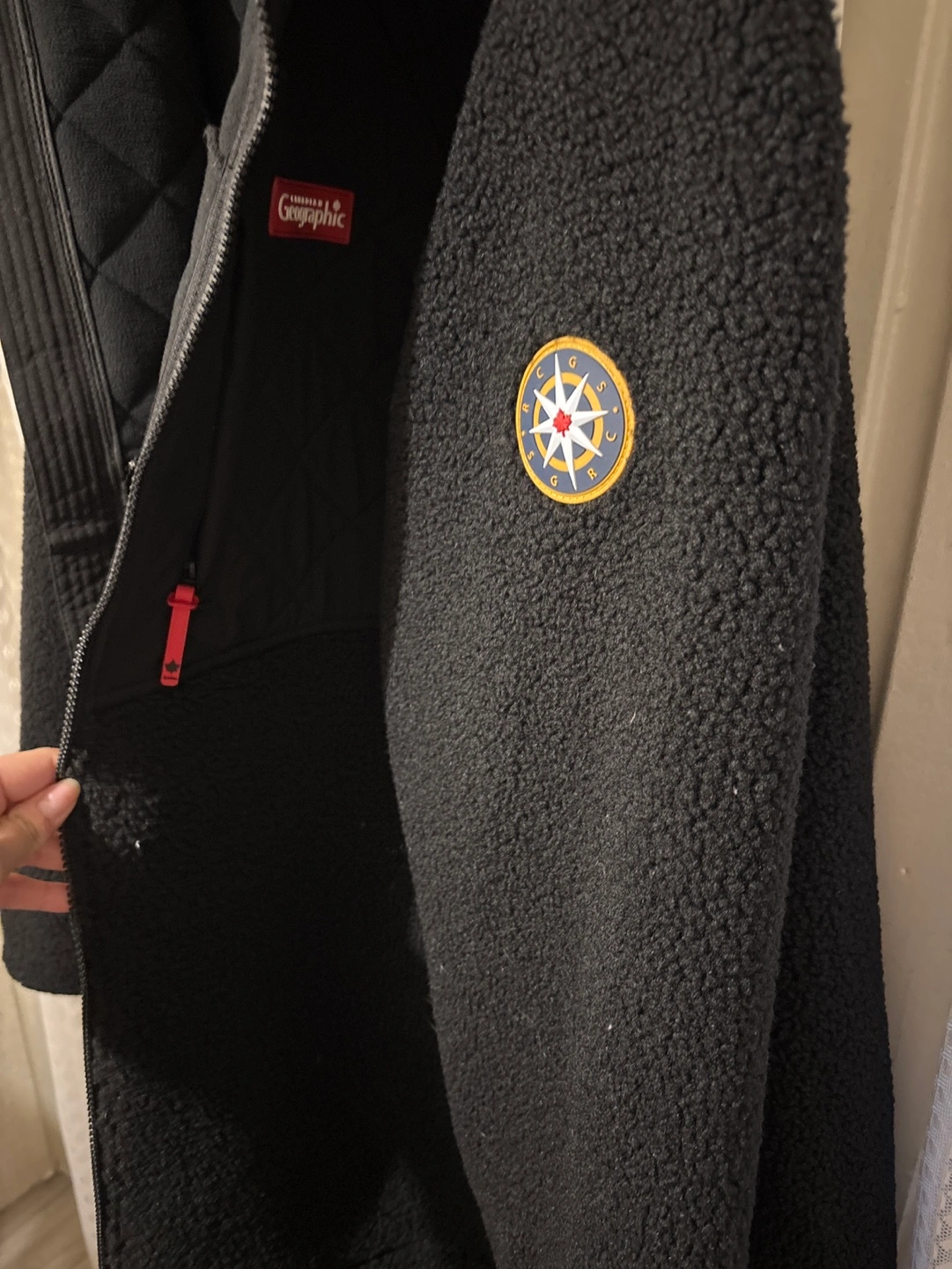 Black fleece jacket. Features a quilted liner and a Canadian Geographic logo patch. Full zip closure. Warm and comfortable.