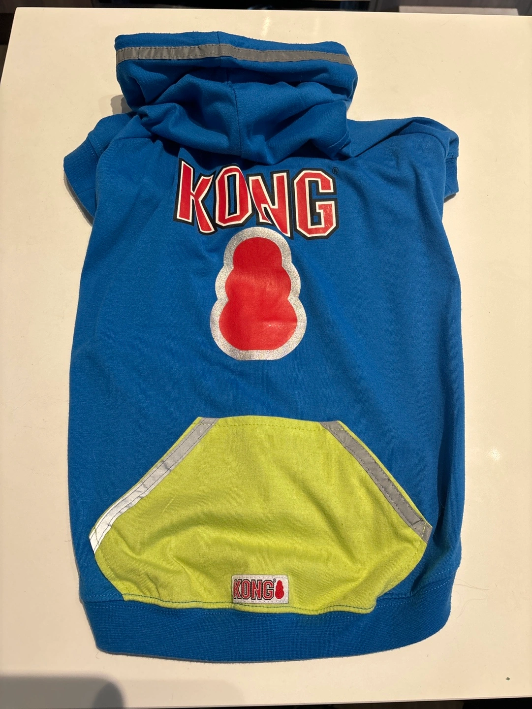 Blue dog hoodie. Size large. Features Kong logo. Short sleeves. Green accents. Has reflective details at hood and pocket. Features a hole you can run your leash through near the neck.