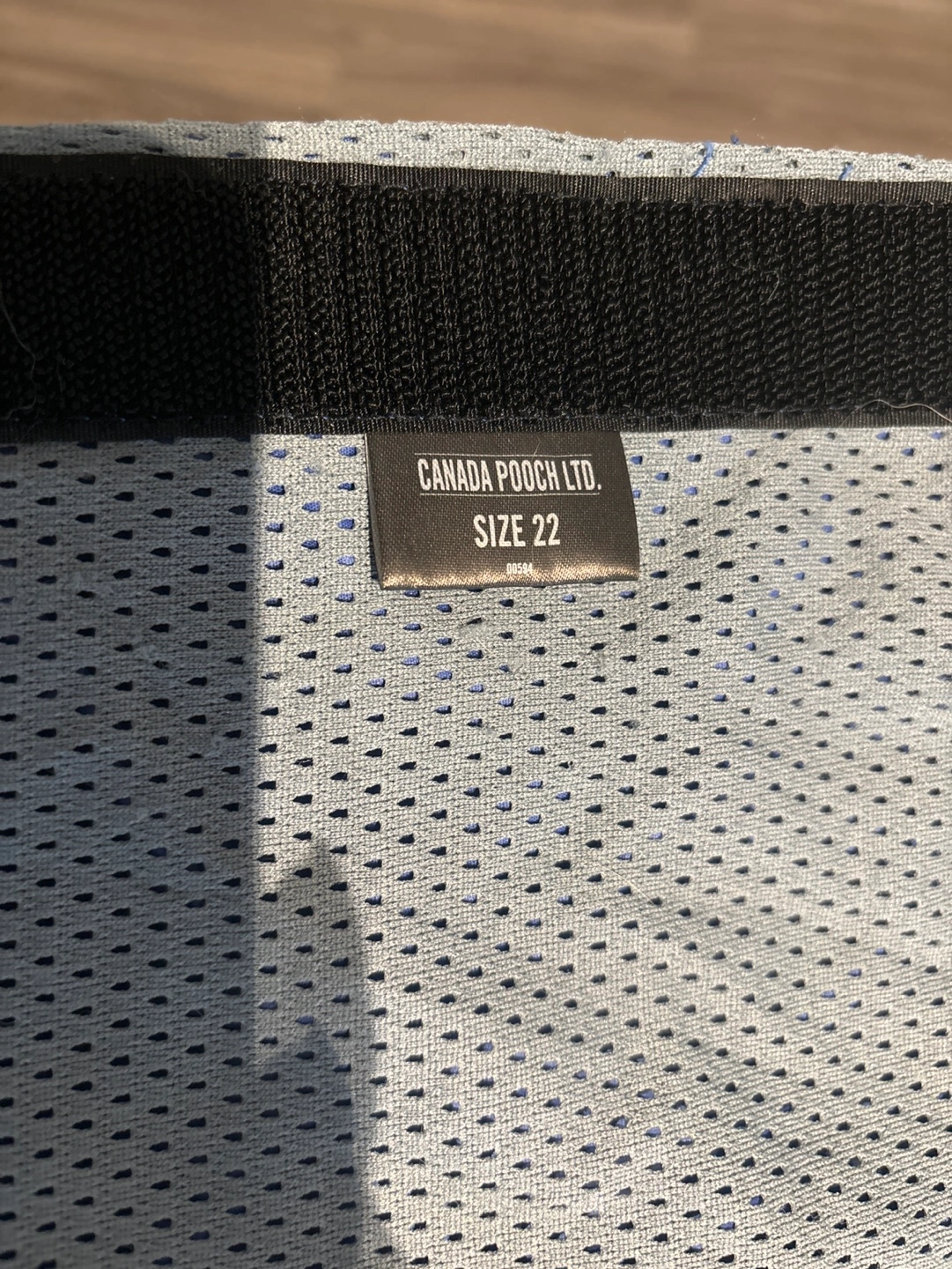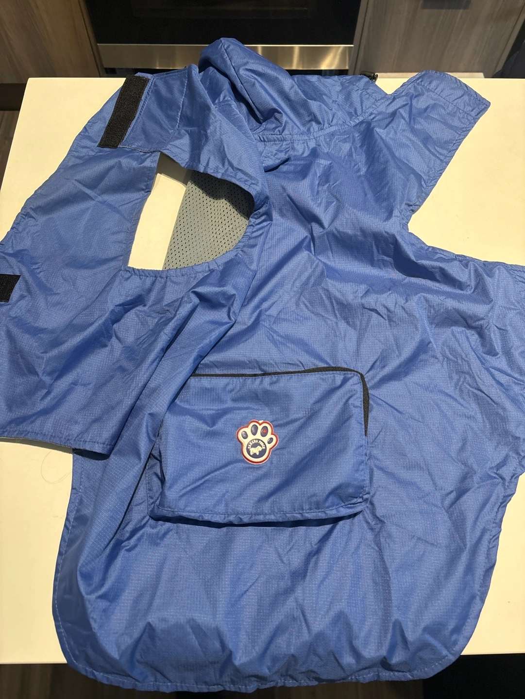 Blue dog raincoat. Size 22. Features a hood and mesh lining. Velcro closures. Small pocket. Like new. Portable design which folds into pocket that has a carabiner.