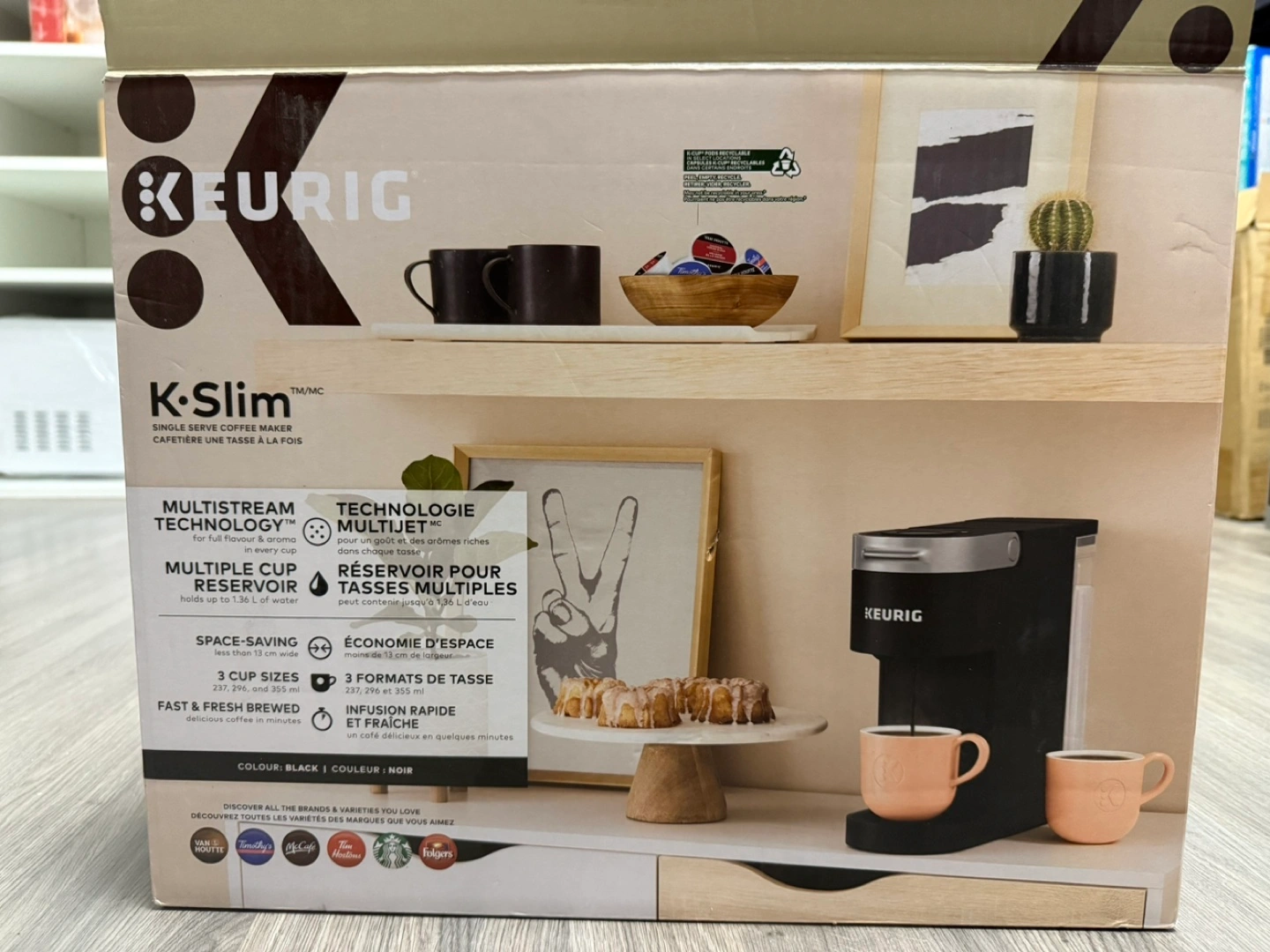 75Start your morning right with the Keurig K-Slim Single-Serve Coffee Maker. This machine is make your favorite coffee blends using pods, ground coffee, or K-Cups. With an 8 oz bean/coffee capacity, this coffee maker is perfect for brewing espresso or any other type of coffee.The Keurig K-Slim features an analog control panel and is powered by electricity with no battery required. Its compact design allows it to fit perfectly in your kitchen, measuring 12.14 inches in height. Pick up in Mississauga near the intersection of Highways 401 and 403