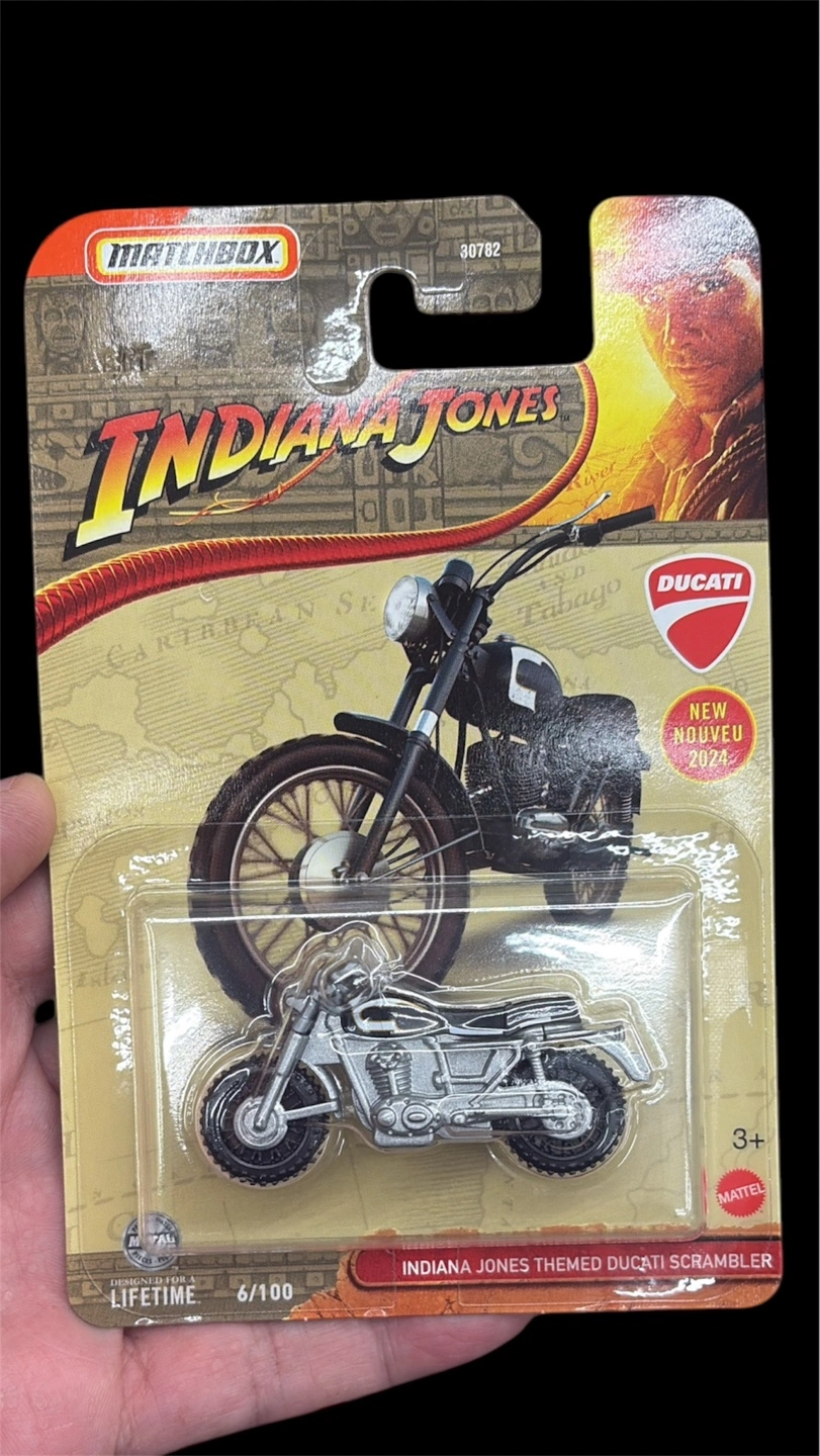 123Collectible Matchbox die-cast motorcycle. Indiana Jones themed Ducati Scrambler. Part of a 100-piece series. New in package.