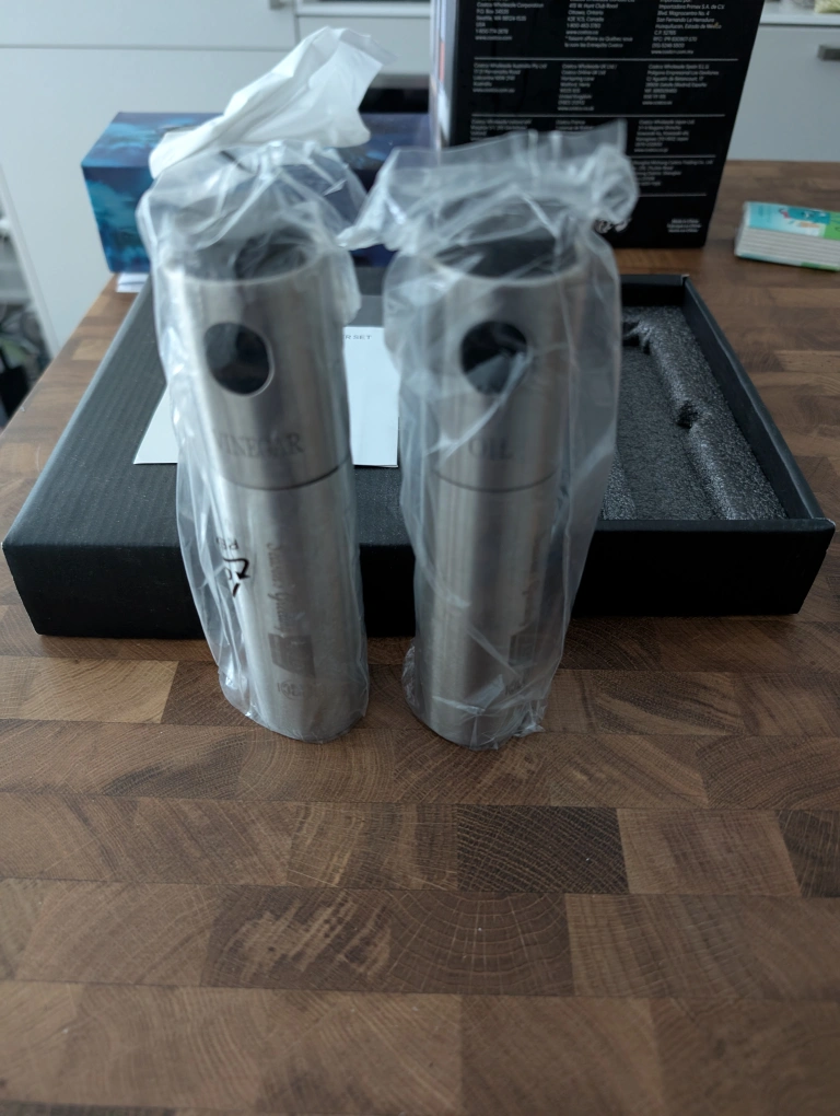 Pair of new stainless steel oil and vinegar dispensers.