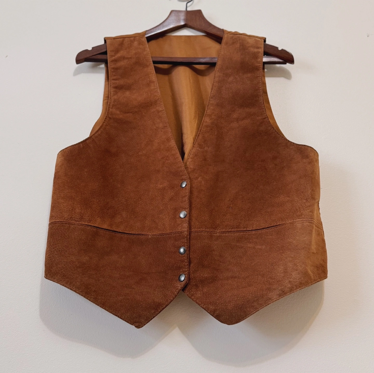 A rugged and timeless vintage suede vest made from 100% genuine leather. Designed with a clean silhouette, metal snap closures, and a classic pointed hem. The interior features a soft acetate lining and an adjustable tie-back for a customized fit. Perfect for western styling, layering over shirts, or adding a vintage edge to your outfit.