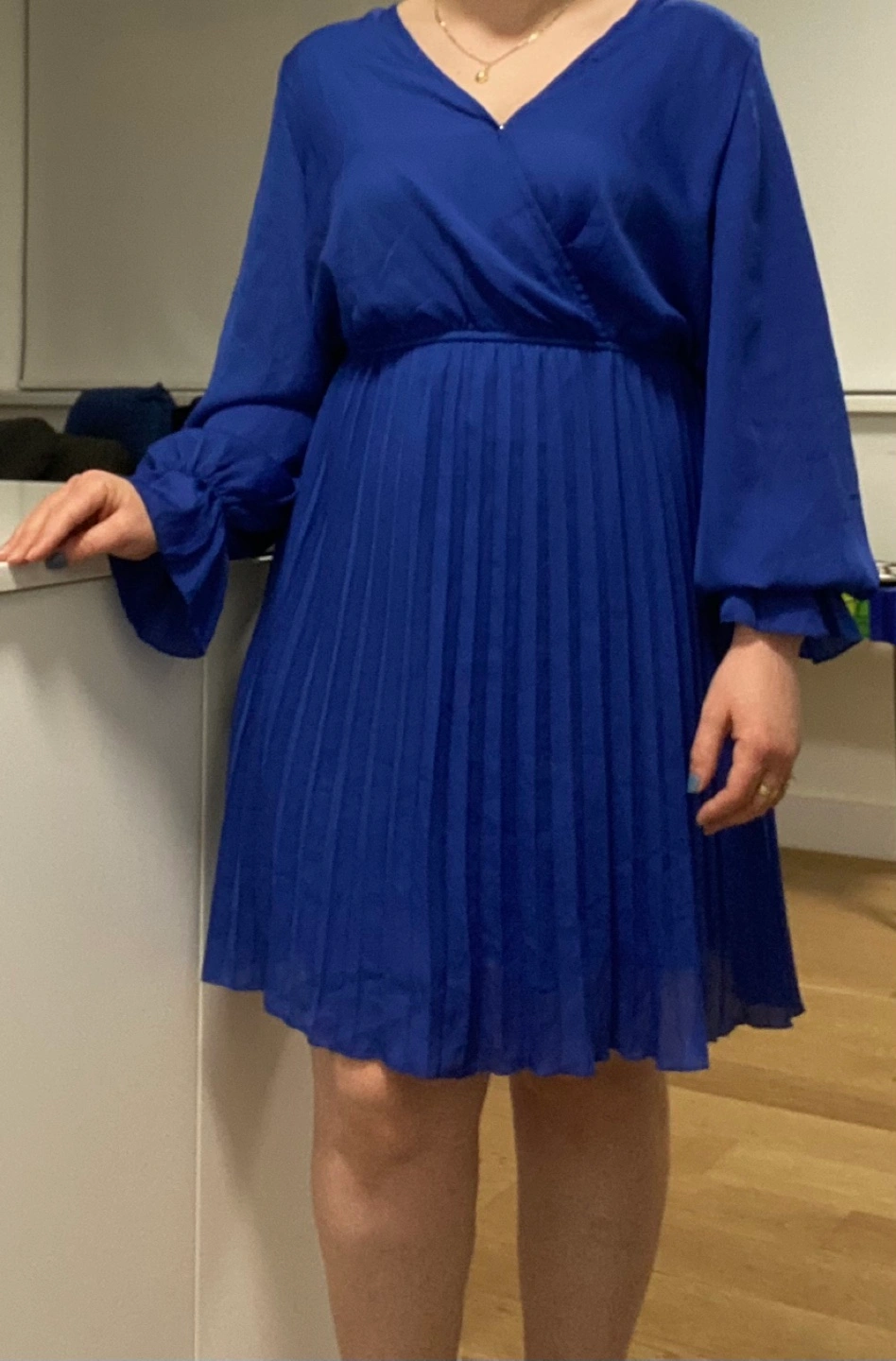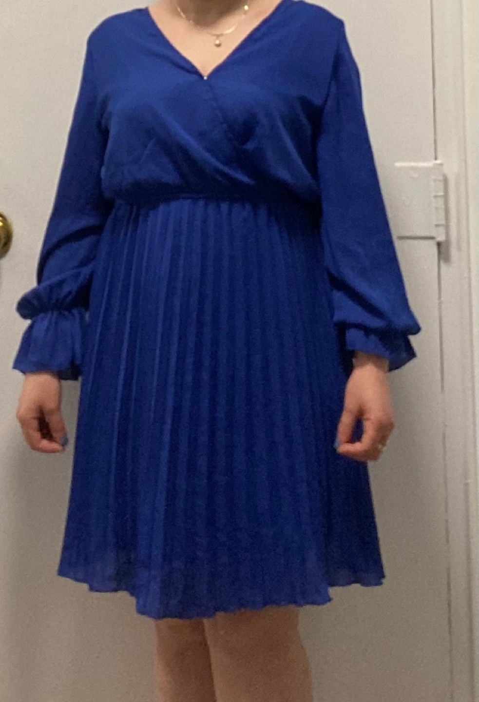 Beautiful royal blue mini dress. Features long sleeves, pleated skirt, and a V-neckline. Perfect for a night out or special occasion.