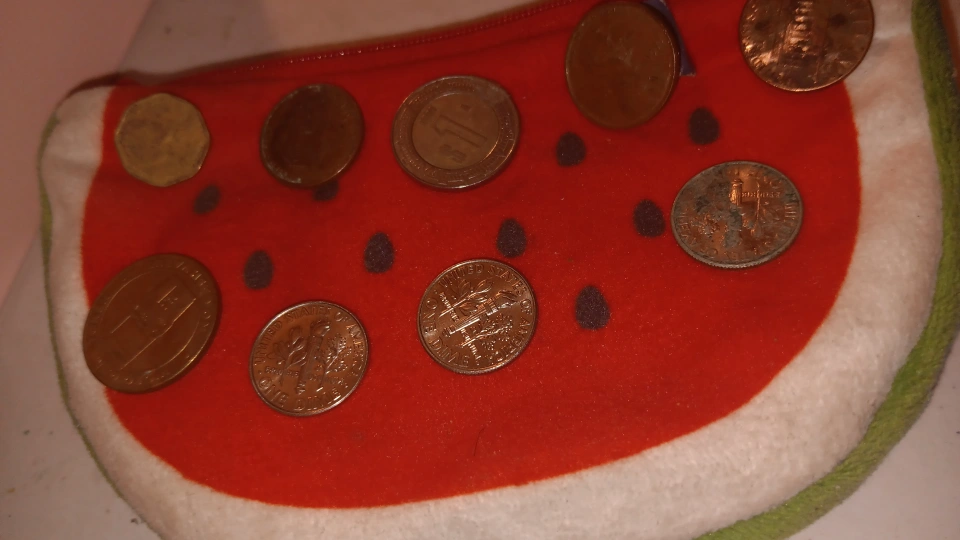 Variety of coins. Includes US and foreign currency. Small watermelon-shaped coin purse. Great for collectors or casual enthusiasts.