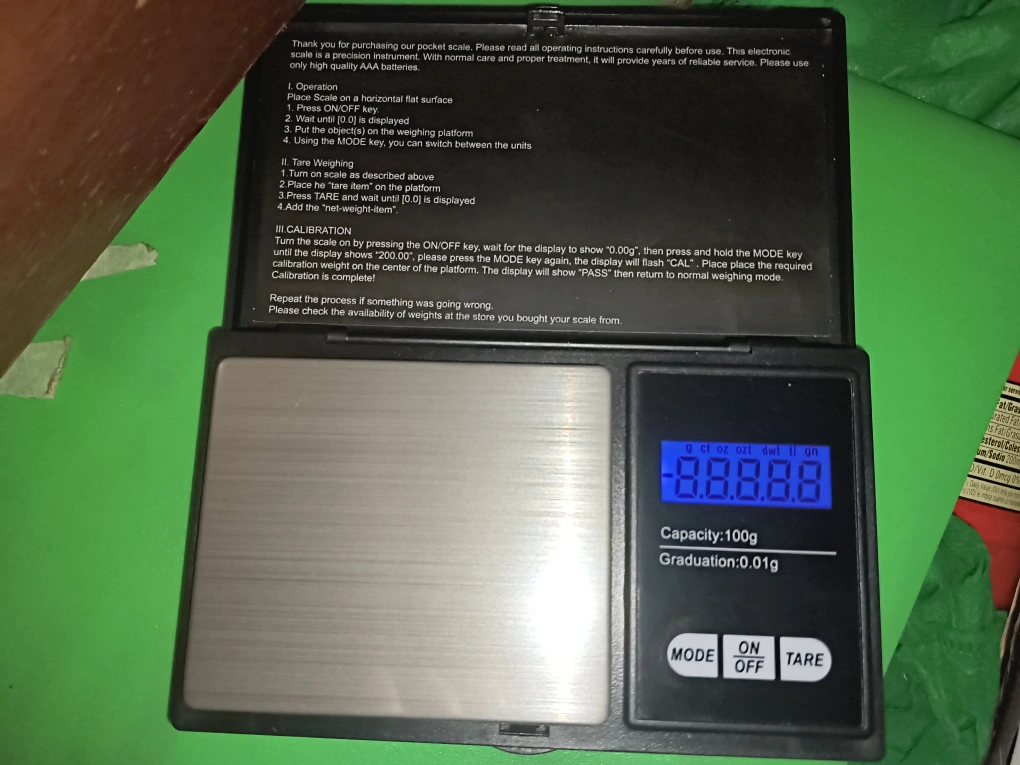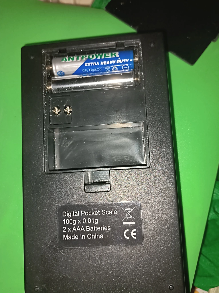 Digital pocket scale. Weighs up to 100g in 0.01g increments. Uses 2 AAA batteries. Made in China. Compact and portable.