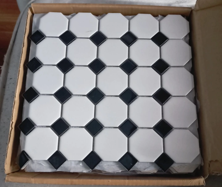 New, opened box of ceramic mosaic tiles. Black and white octagon pattern. Perfect for home renovations or DIY projects.