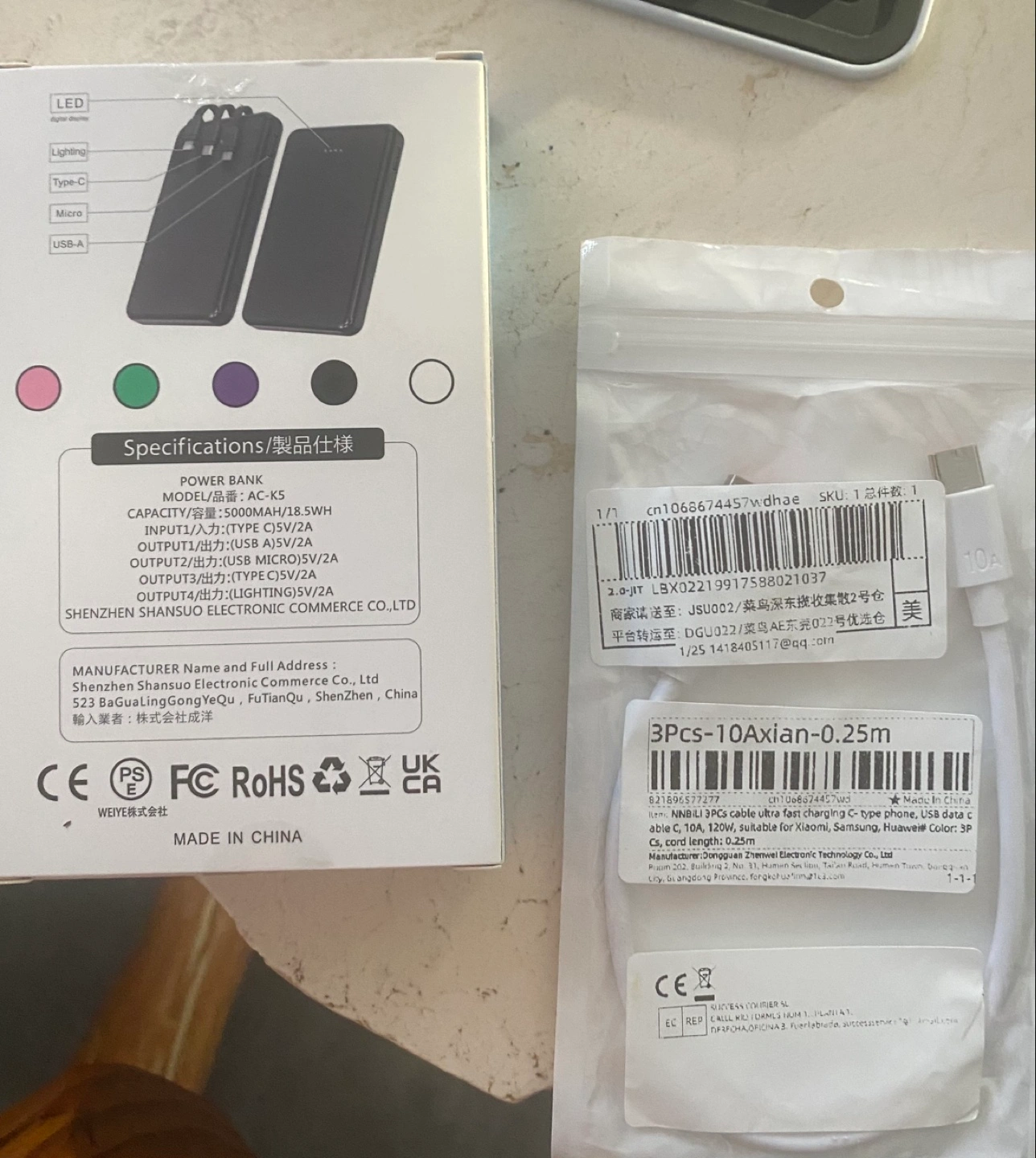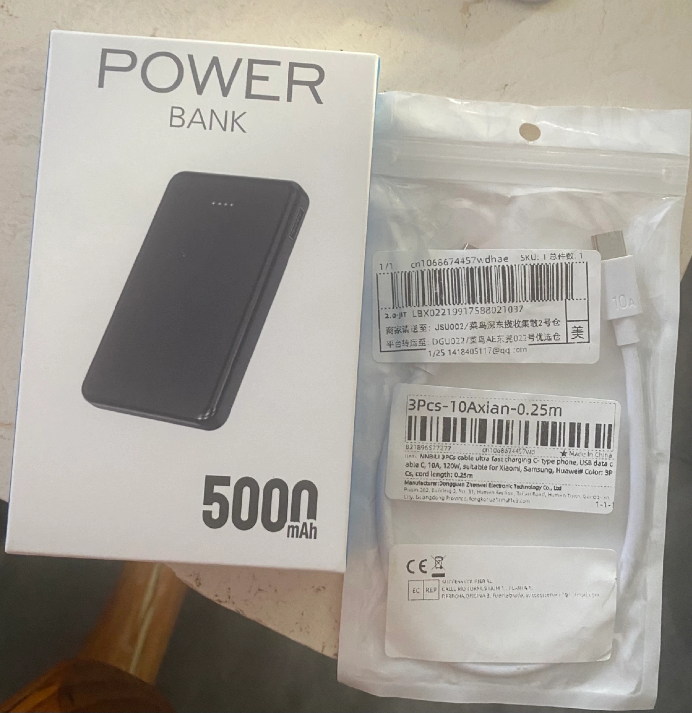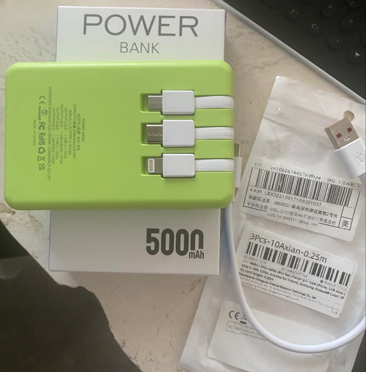 Brand new Slim power bank. 5000mAh capacity. Includes three cables: USB-A, Micro-USB, and Lightning. Charges multiple devices simultaneously. Compact and portable design. Perfect for travel.