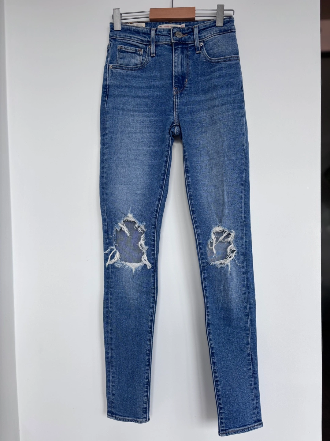 Women's Levi's 721 High Rise Skinny jeans. Size 23. Distressed detail at knees.