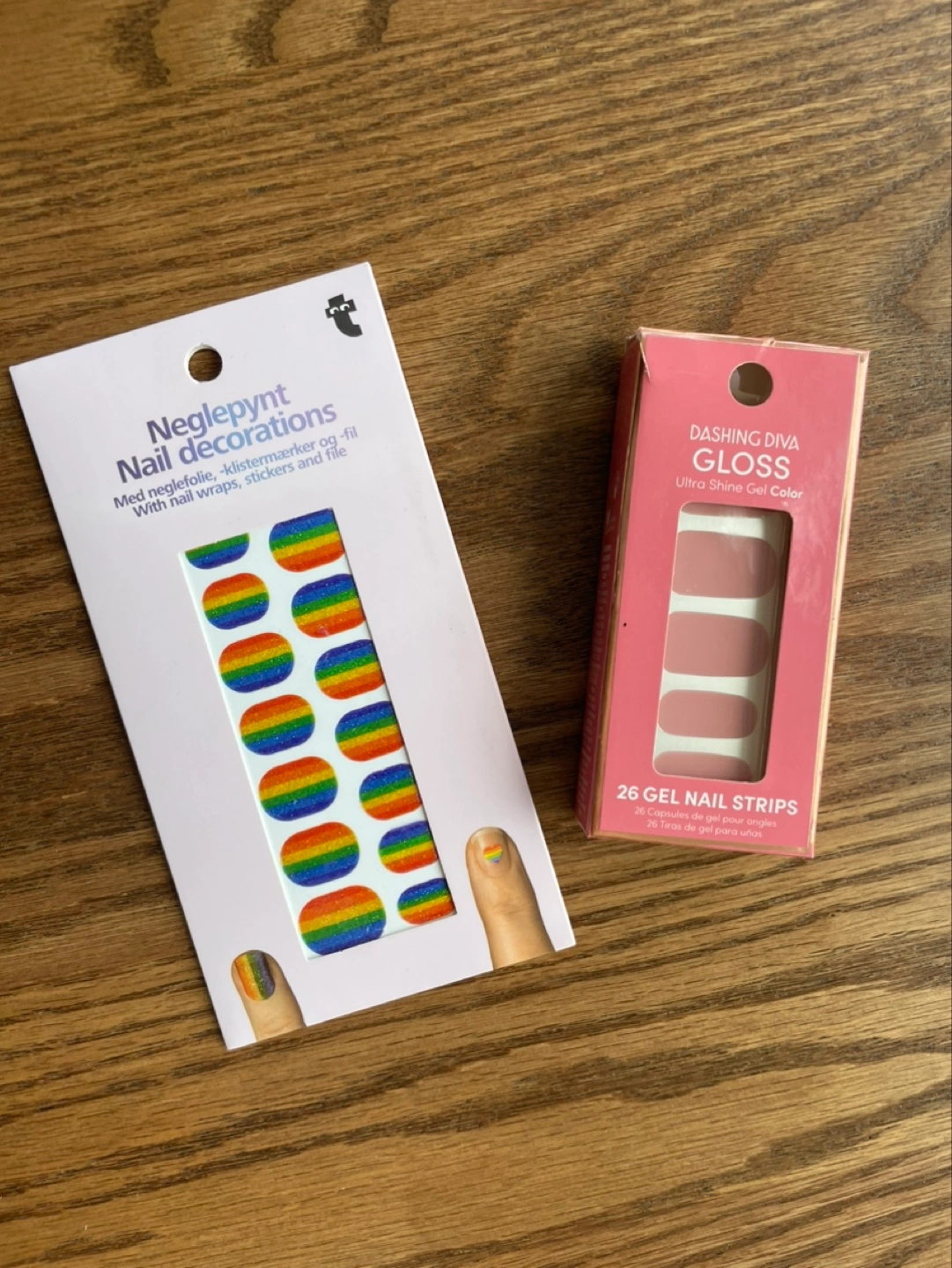 Two sets of nail wraps. One features rainbow designs, the other a solid pink. Includes file!