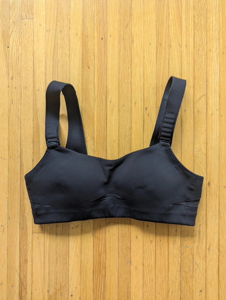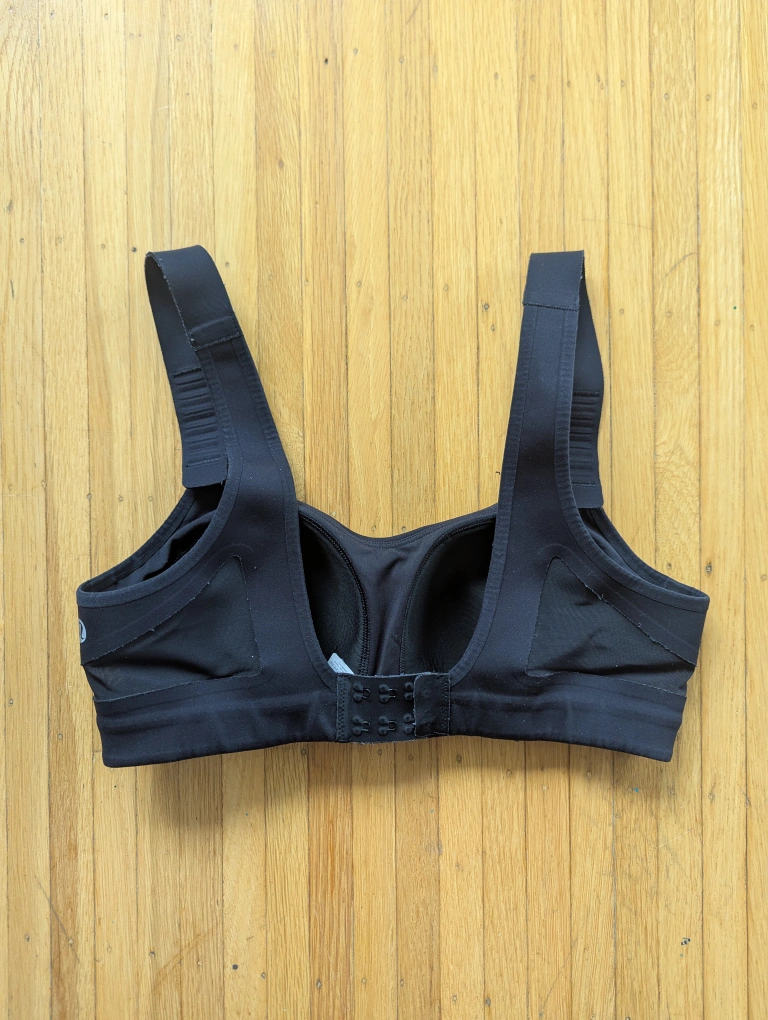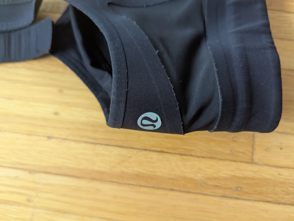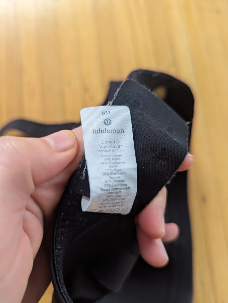 Black Lululemon sports bra. Size 32B. Excellent support. Hook and eye closure. Adjustable straps. Wide straps. Molded cups.
