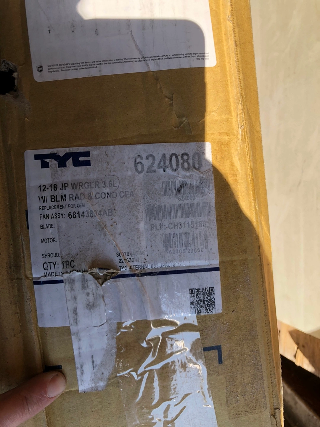 78New in box TYC radiator fan assembly. Part number 624080. Fits 2012-2018 Jeep Wrangler 3.6L. Includes motor, shroud, and blades. Never installed.