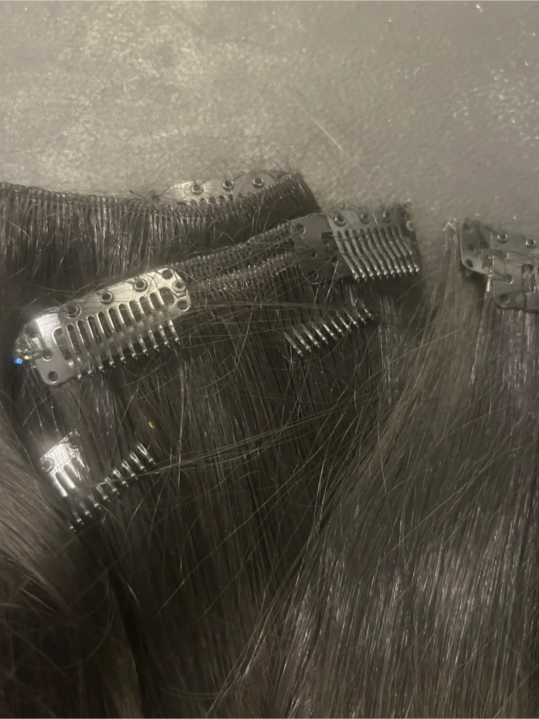 Clip-in hair extensions. Long, black hair. Heat resistant up to 428°F. Great for adding length and volume. With clips