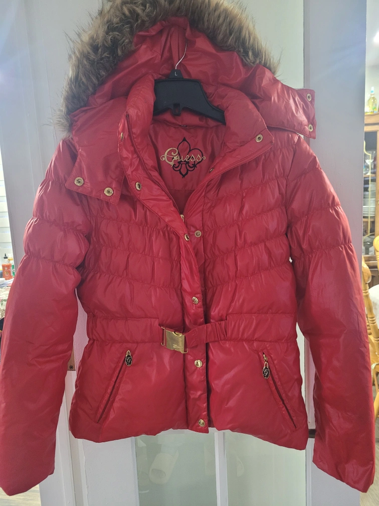 Red Guess Puffer Jacket with Fur Trimmed Hood